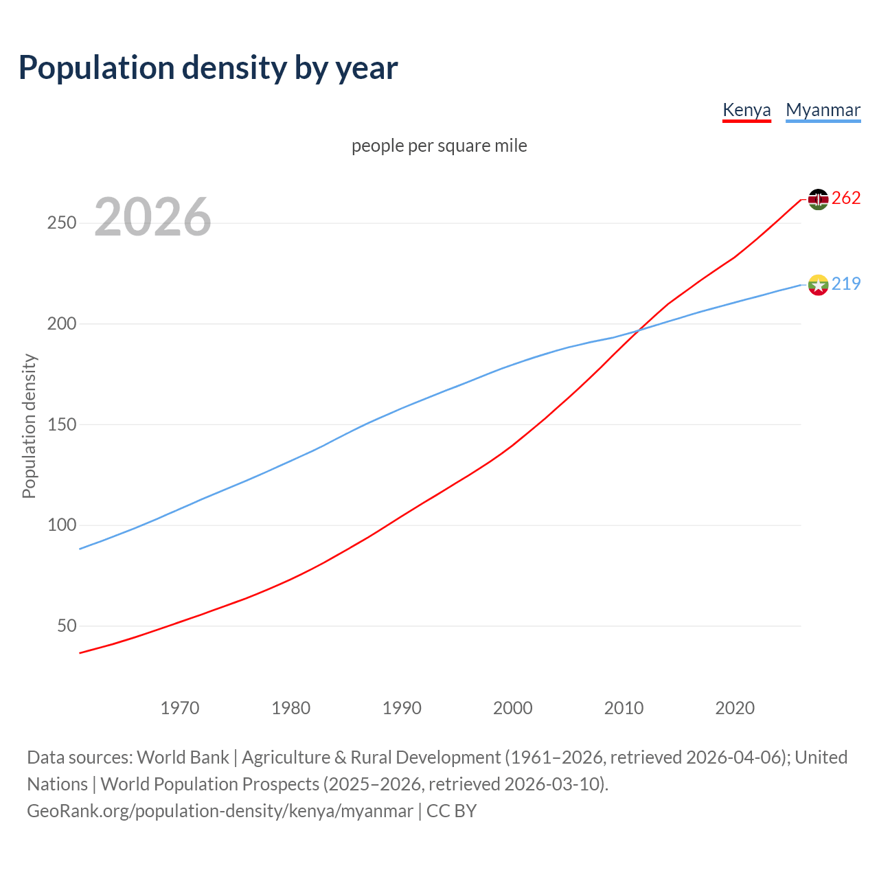 From 2006 to 2026, population density in Kenya increased by 55.7%, compared to a 15.7% growth in Myanmar.