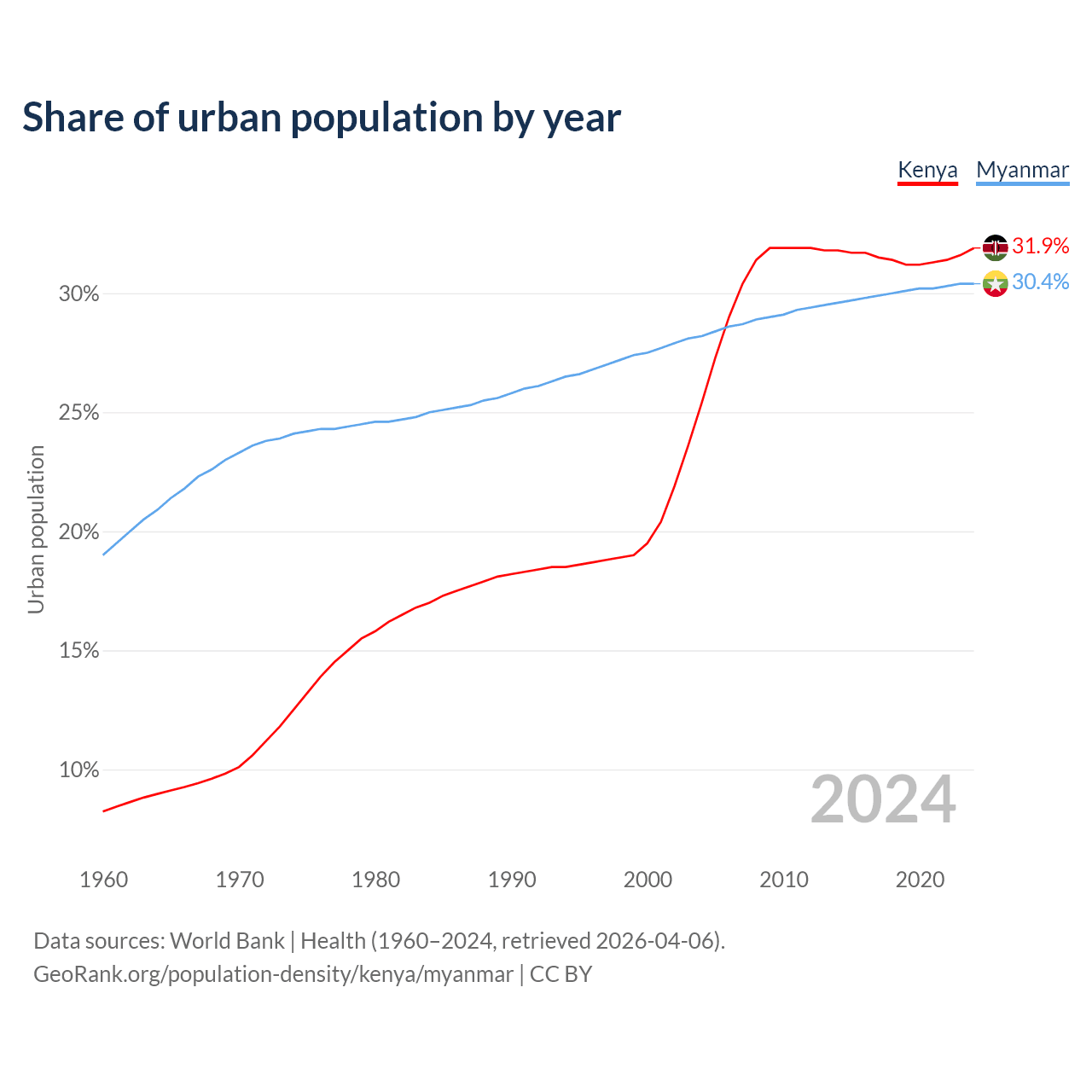 From 2004 to 2024, the share of urban population changed from 25.4% to 31.9% in Kenya and from 28.2% to 30.4% in Myanmar.