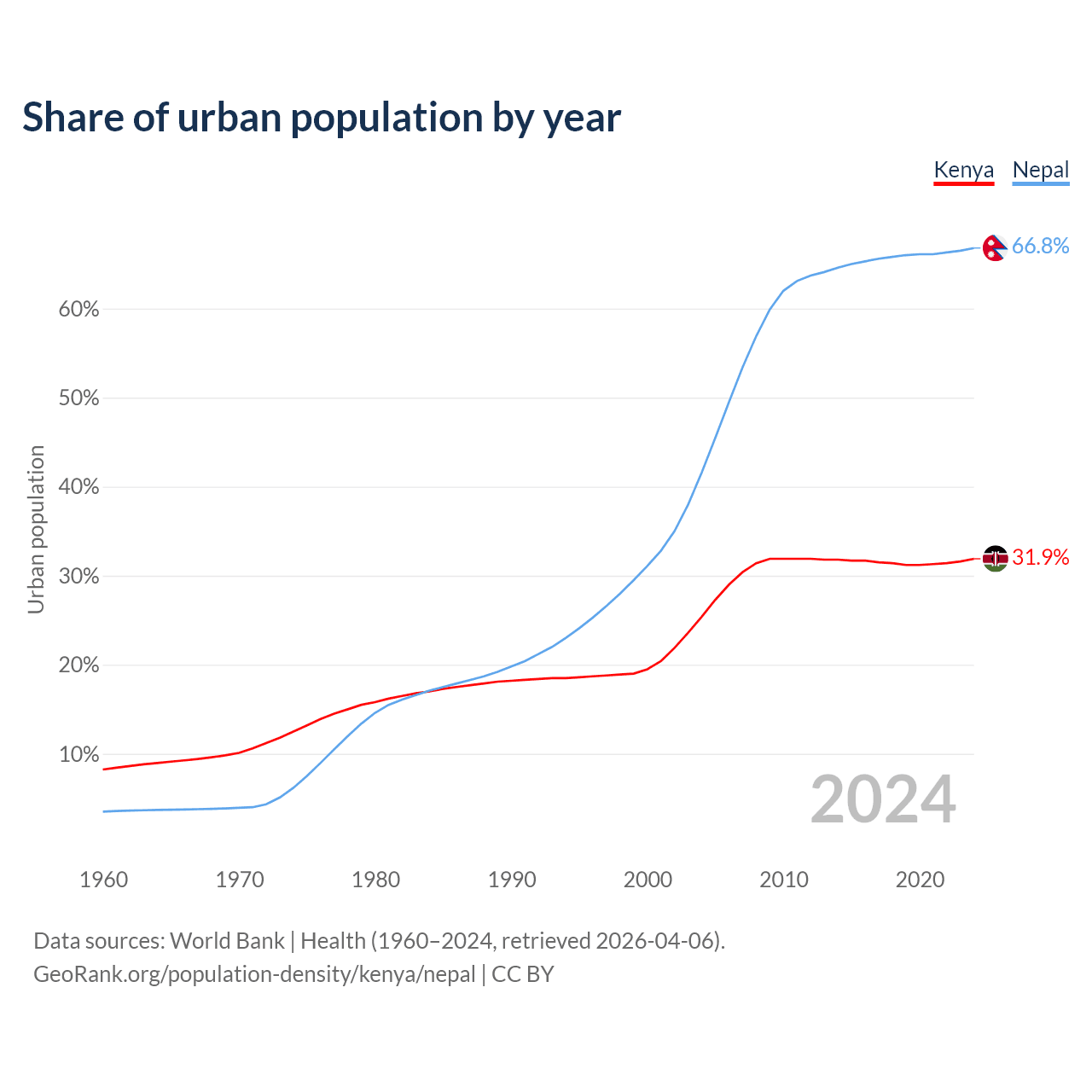 From 2004 to 2024, the share of urban population changed from 25.4% to 31.9% in Kenya and from 41.6% to 66.8% in Nepal.