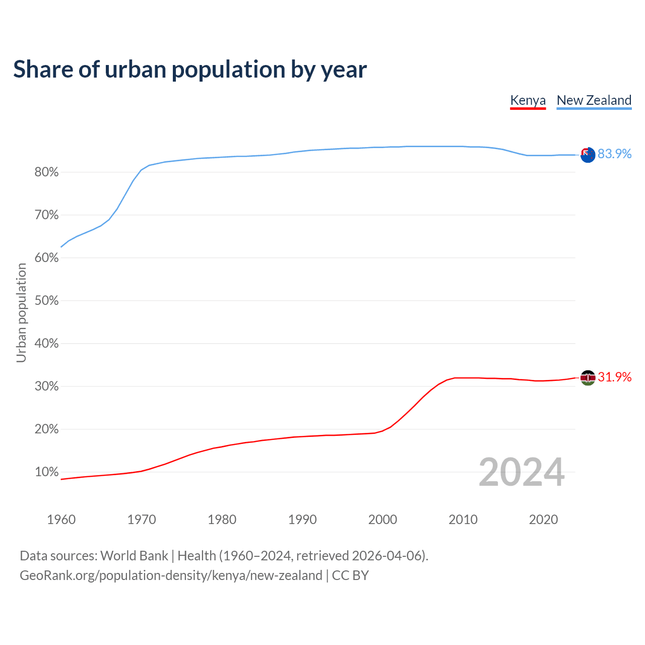 From 2004 to 2024, the share of urban population changed from 25.4% to 31.9% in Kenya and from 85.9% to 83.9% in New Zealand.