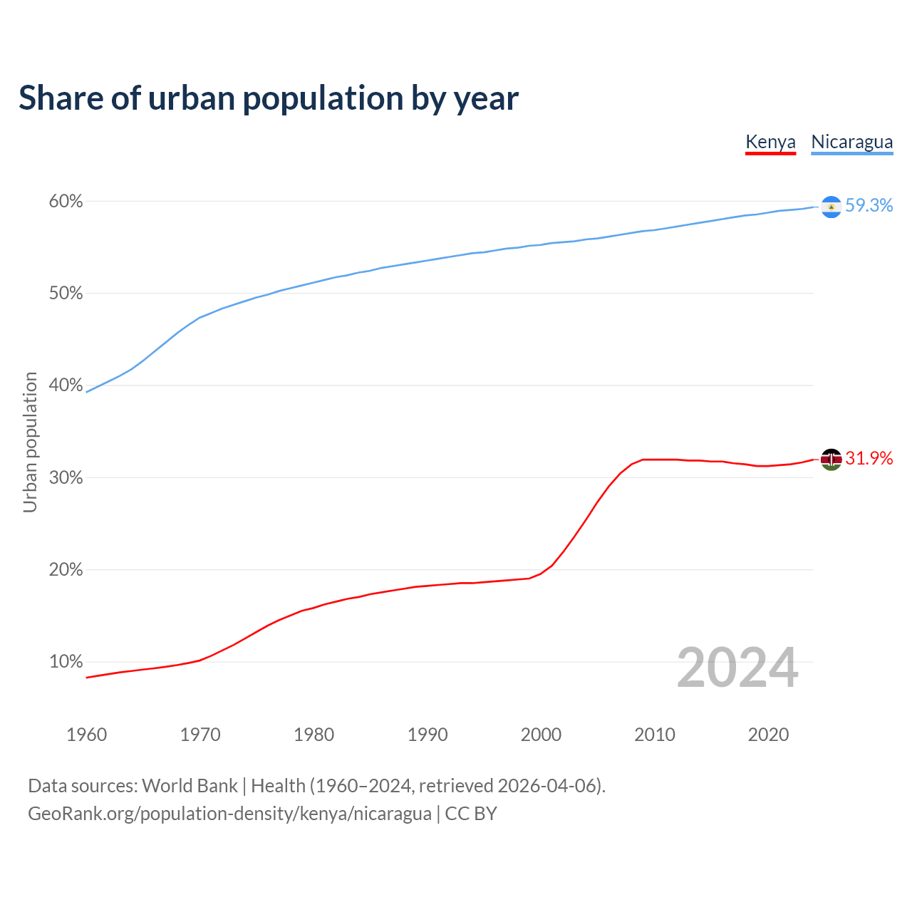 From 2004 to 2024, the share of urban population changed from 25.4% to 31.9% in Kenya and from 55.8% to 59.3% in Nicaragua.