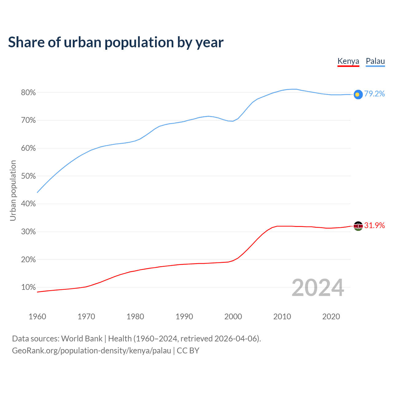 From 2004 to 2024, the share of urban population changed from 25.4% to 31.9% in Kenya and from 76.4% to 79.2% in Palau.