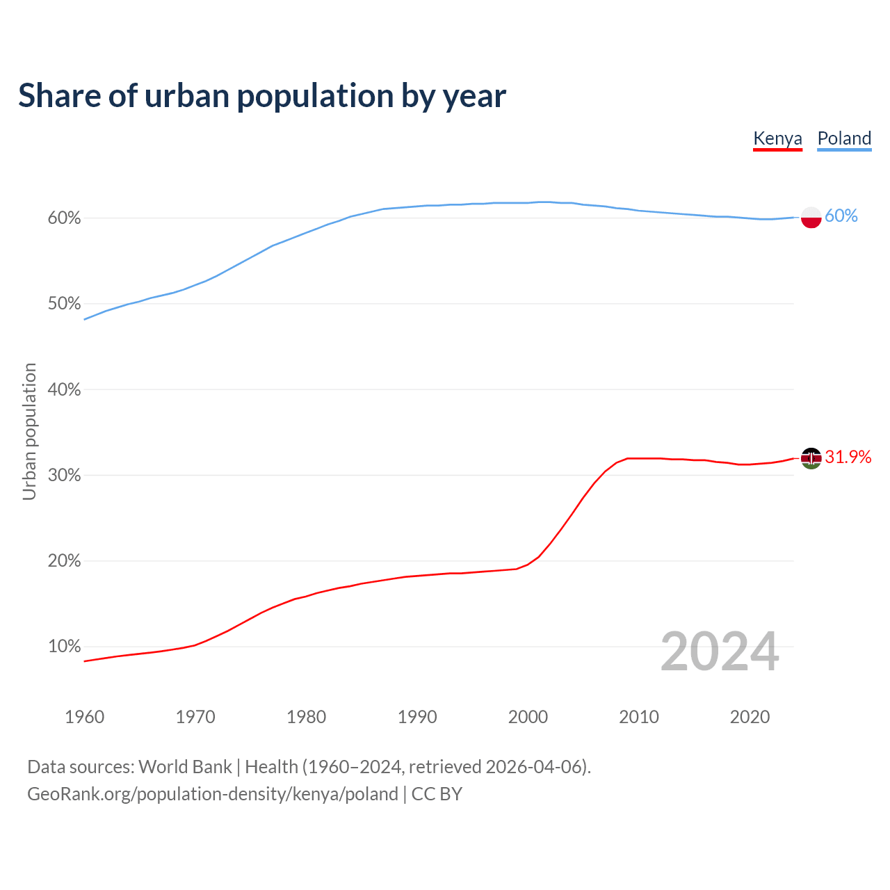 From 2004 to 2024, the share of urban population changed from 25.4% to 31.9% in Kenya and from 61.7% to 60% in Poland.
