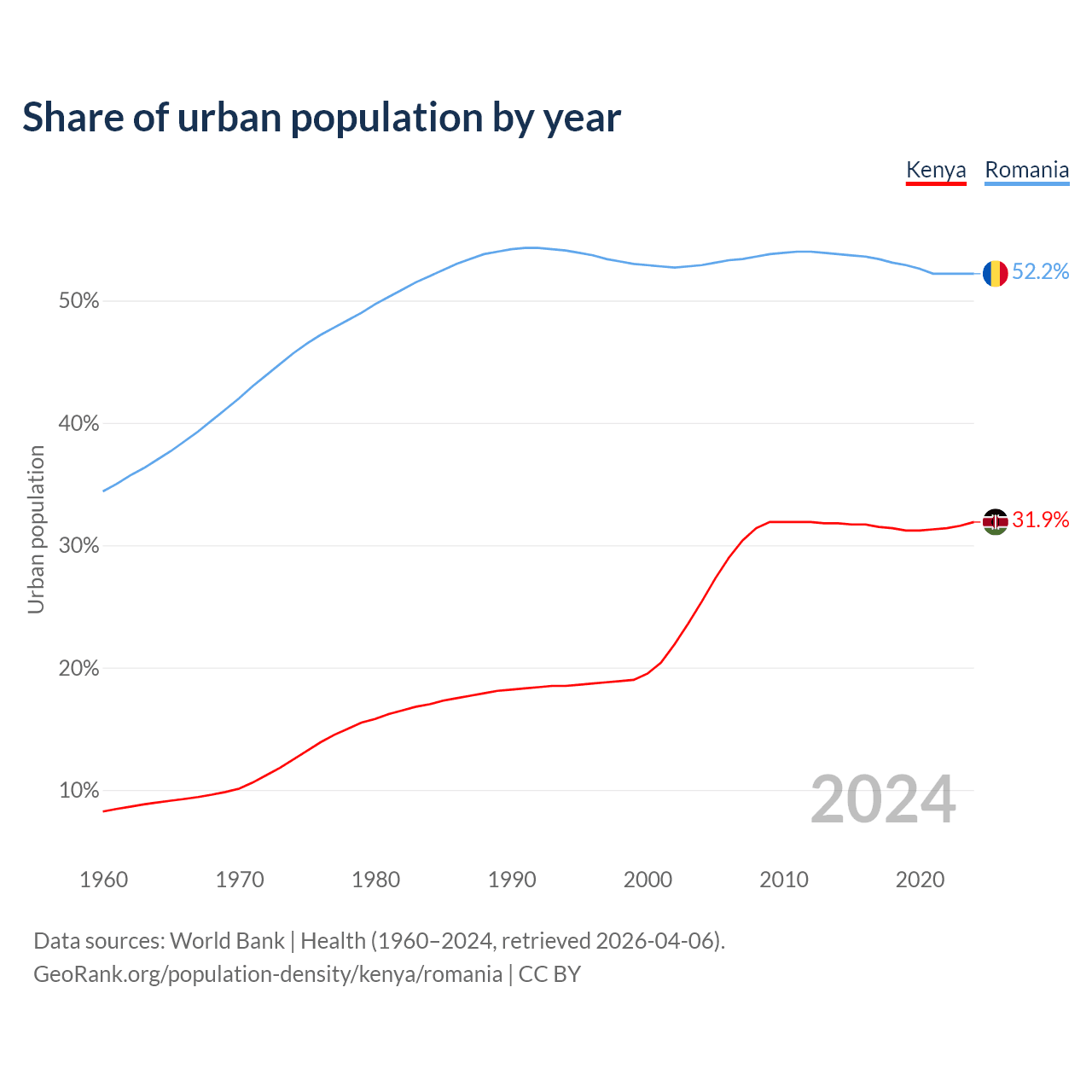 From 2004 to 2024, the share of urban population changed from 25.4% to 31.9% in Kenya and from 52.9% to 52.2% in Romania.