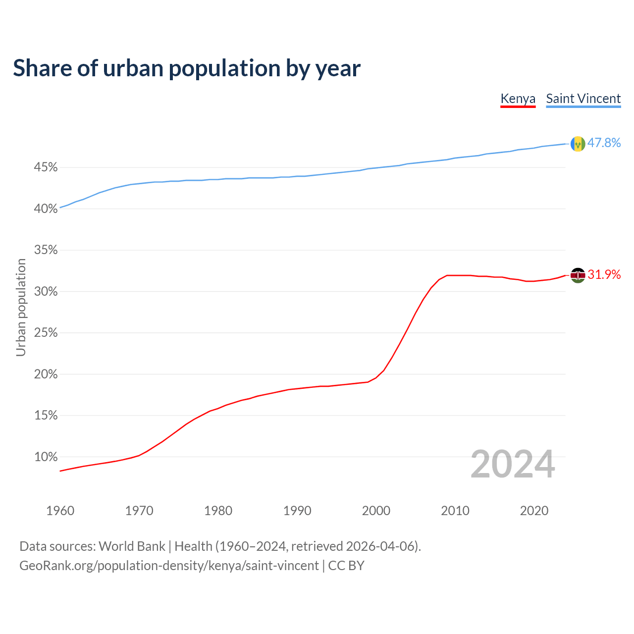 From 2004 to 2024, the share of urban population changed from 25.4% to 31.9% in Kenya and from 45.4% to 47.8% in Saint Vincent.