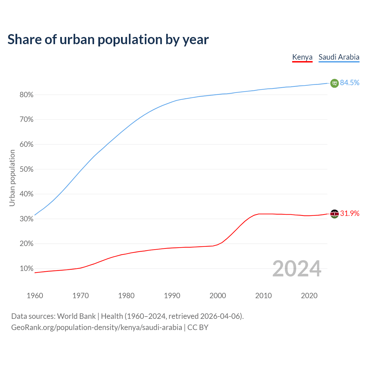 From 2004 to 2024, the share of urban population changed from 25.4% to 31.9% in Kenya and from 80.8% to 84.5% in Saudi Arabia.