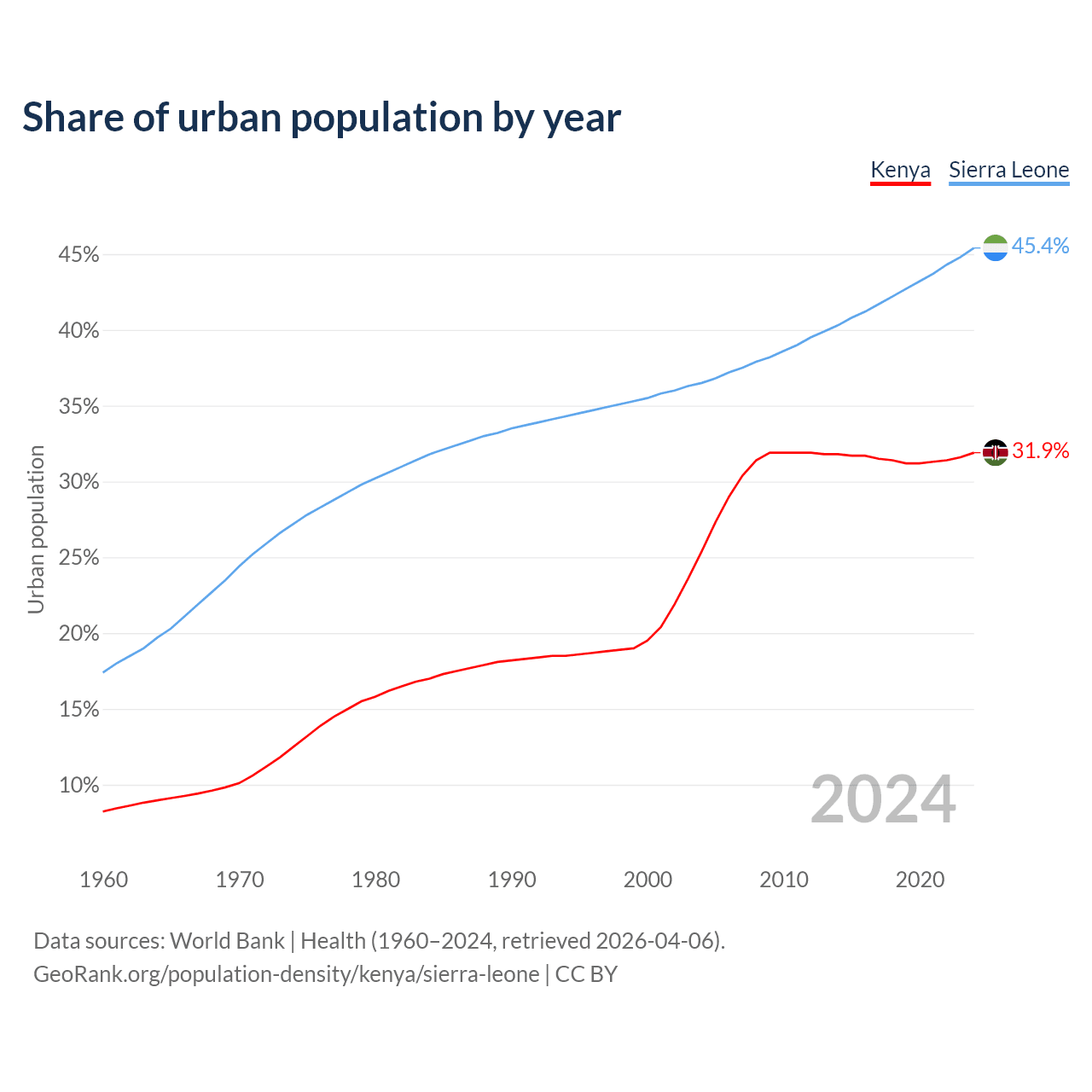 From 2004 to 2024, the share of urban population changed from 25.4% to 31.9% in Kenya and from 36.5% to 45.4% in Sierra Leone.