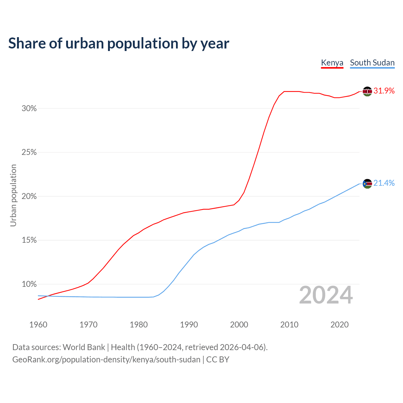 From 2004 to 2024, the share of urban population changed from 25.4% to 31.9% in Kenya and from 16.8% to 21.4% in South Sudan.
