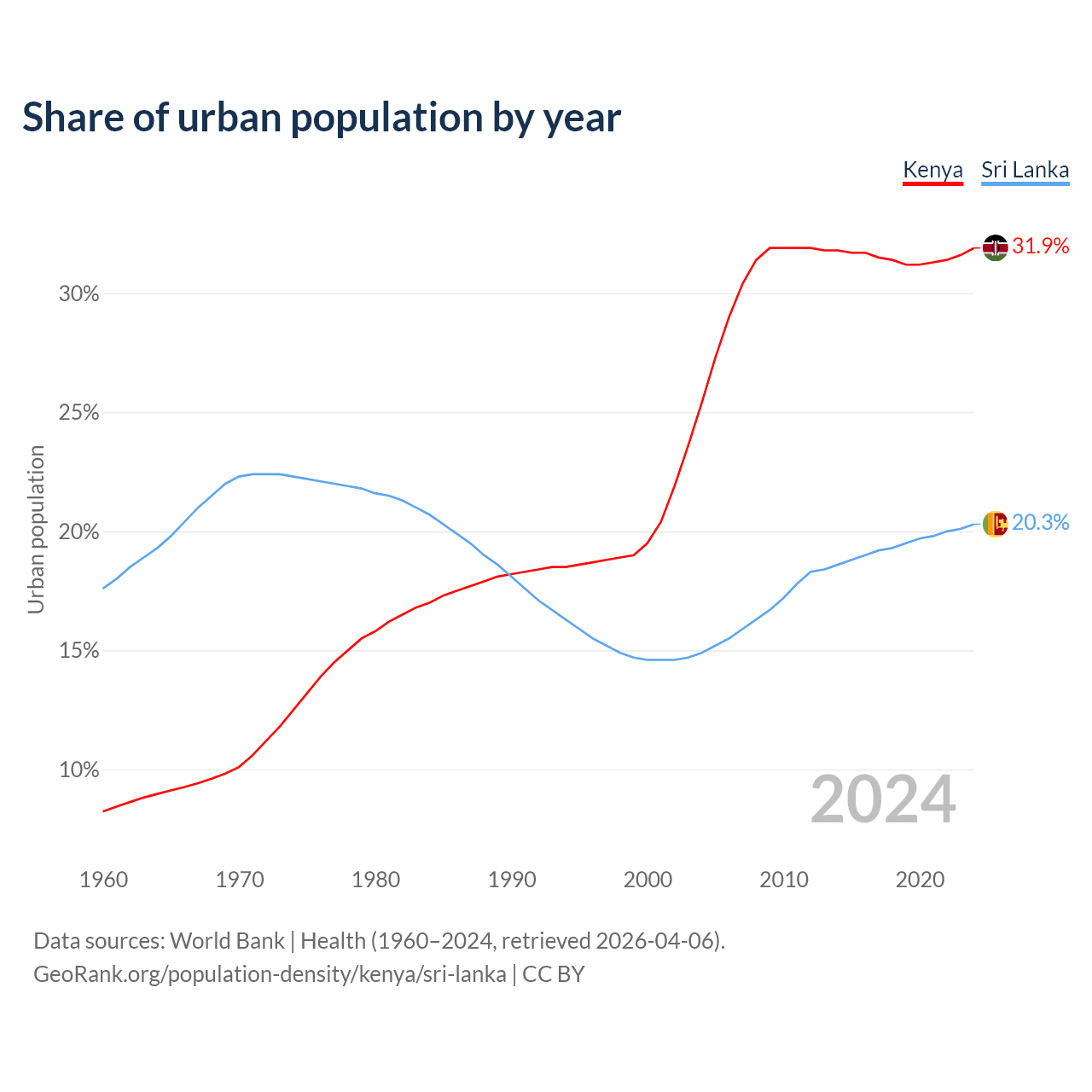 From 2004 to 2024, the share of urban population changed from 25.4% to 31.9% in Kenya and from 14.9% to 20.3% in Sri Lanka.