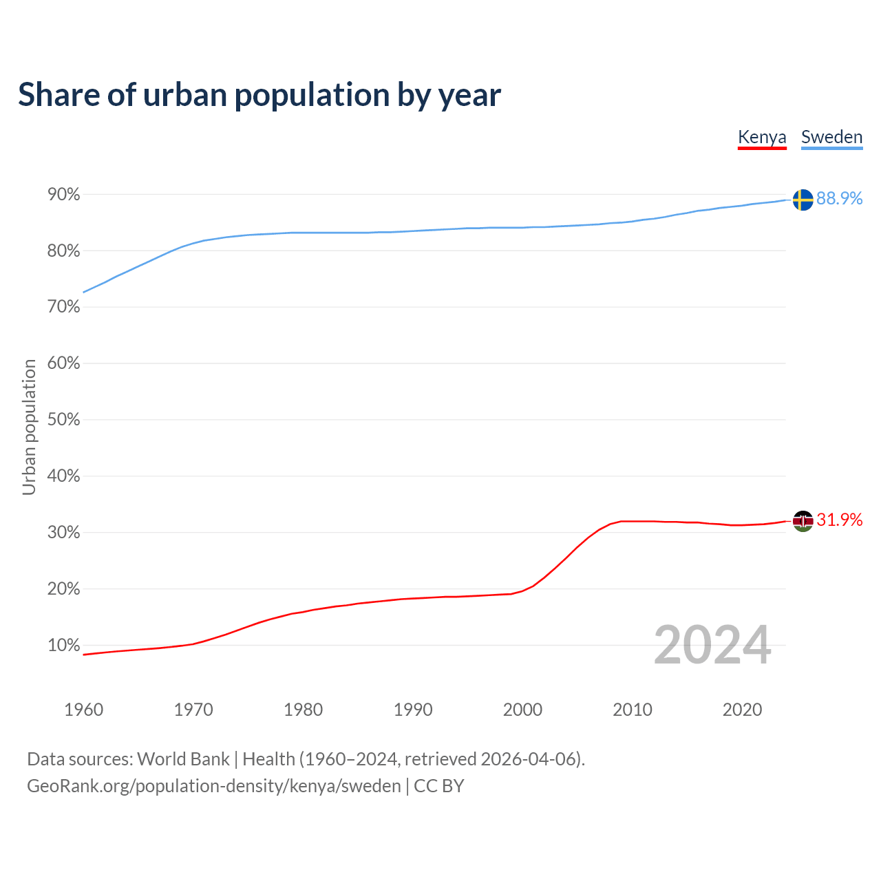 From 2004 to 2024, the share of urban population changed from 25.4% to 31.9% in Kenya and from 84.3% to 88.9% in Sweden.