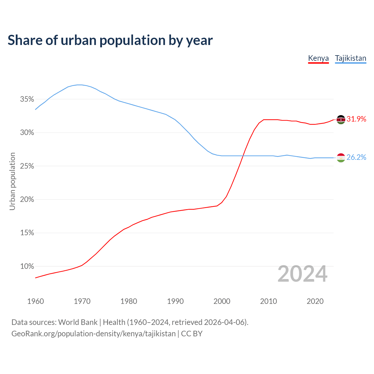 From 2004 to 2024, the share of urban population changed from 25.4% to 31.9% in Kenya and from 26.5% to 26.2% in Tajikistan.