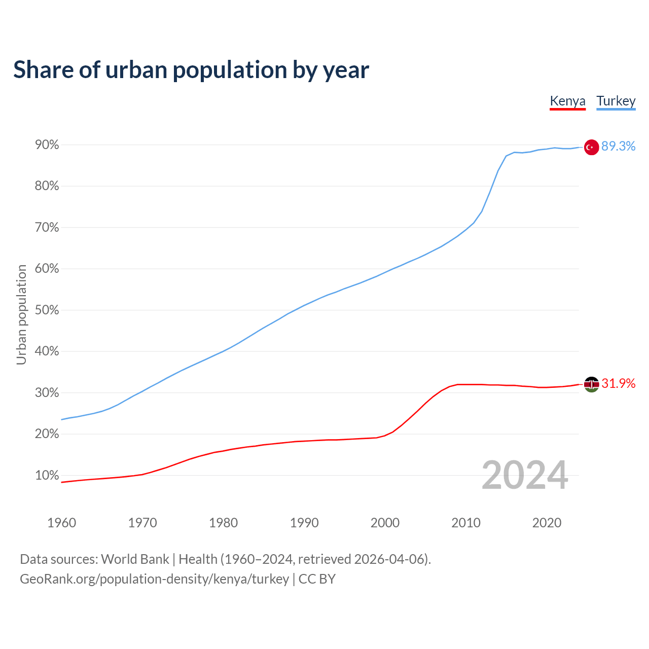 From 2004 to 2024, the share of urban population changed from 25.4% to 31.9% in Kenya and from 62.4% to 89.3% in Turkey.