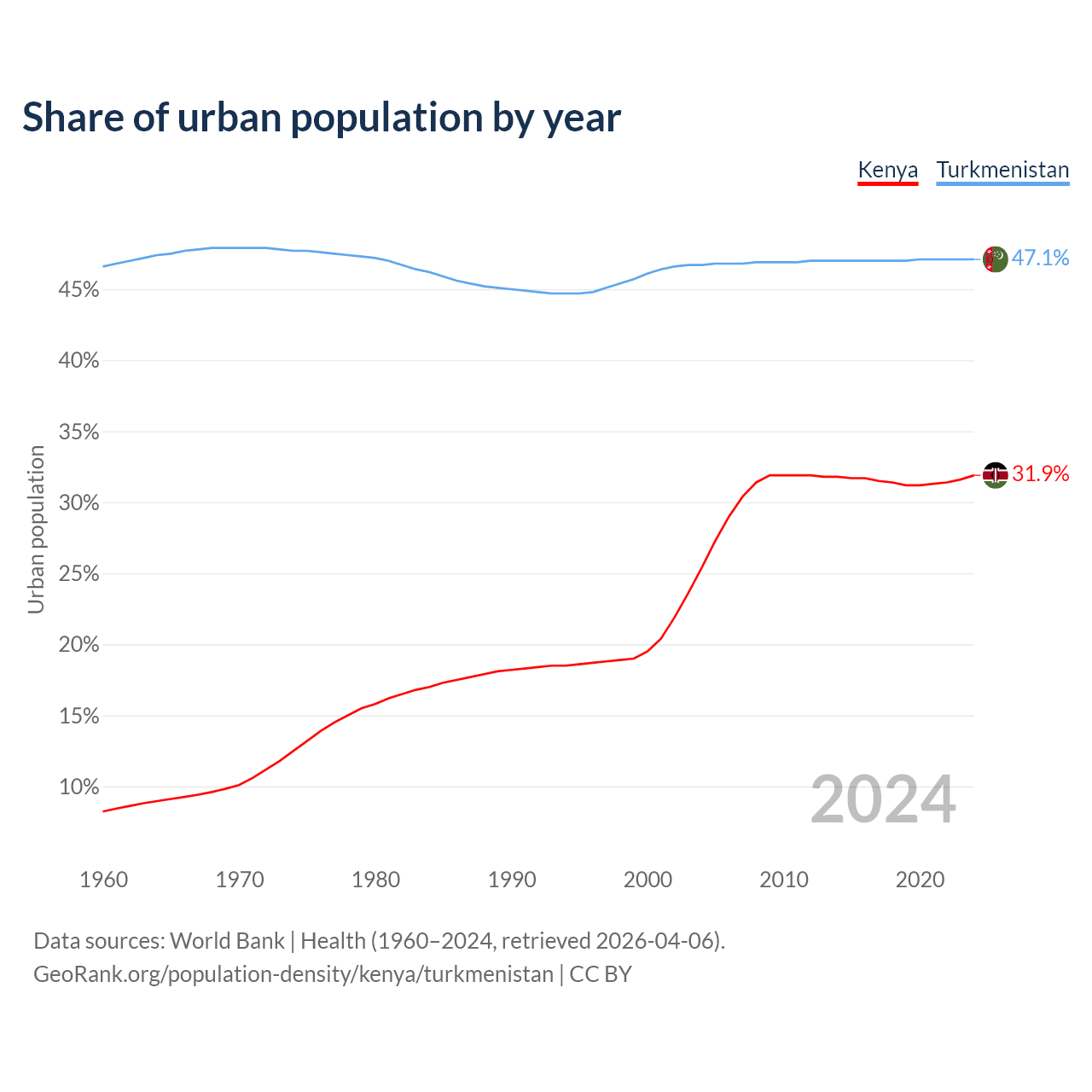From 2004 to 2024, the share of urban population changed from 25.4% to 31.9% in Kenya and from 46.7% to 47.1% in Turkmenistan.