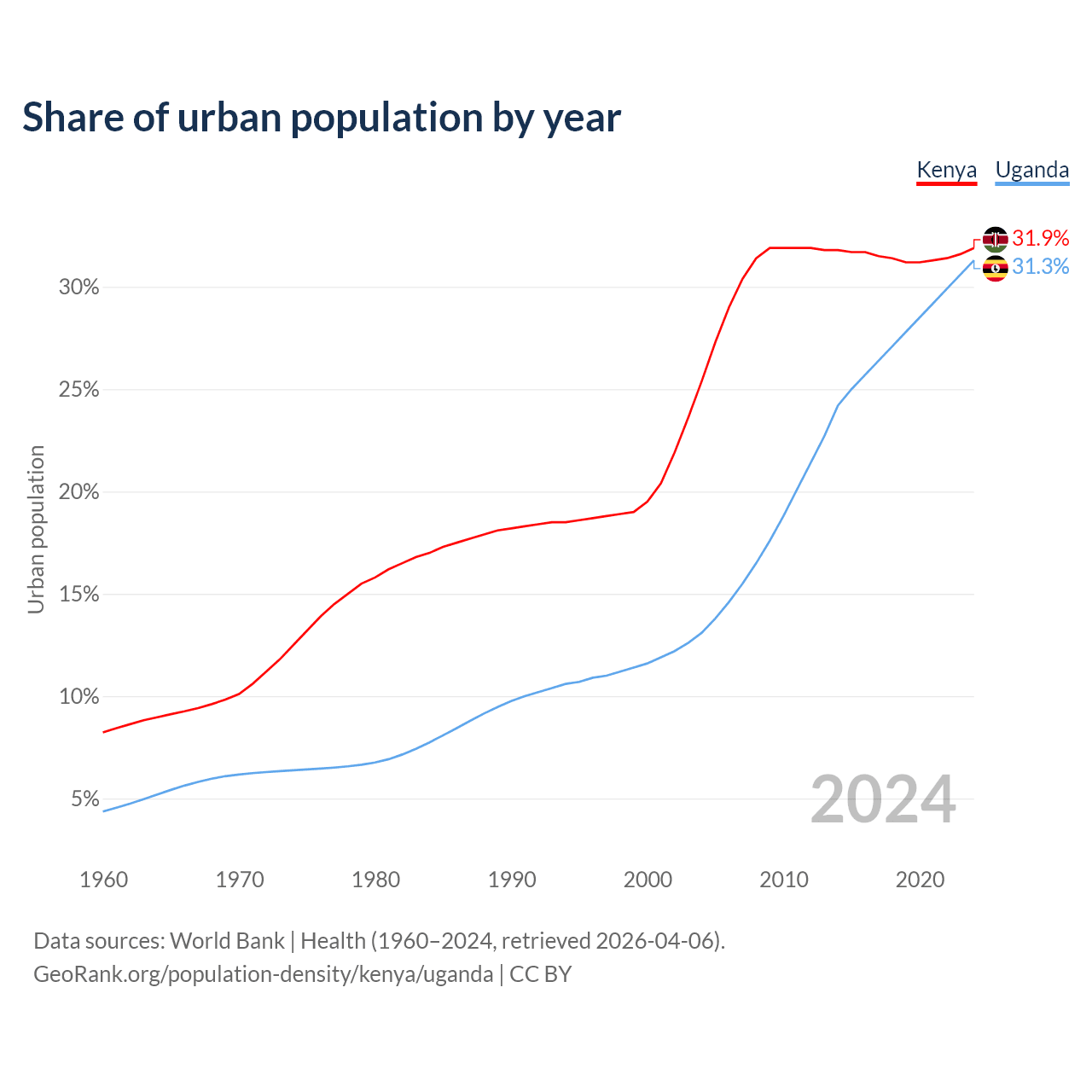 From 2004 to 2024, the share of urban population changed from 25.4% to 31.9% in Kenya and from 13.1% to 31.3% in Uganda.