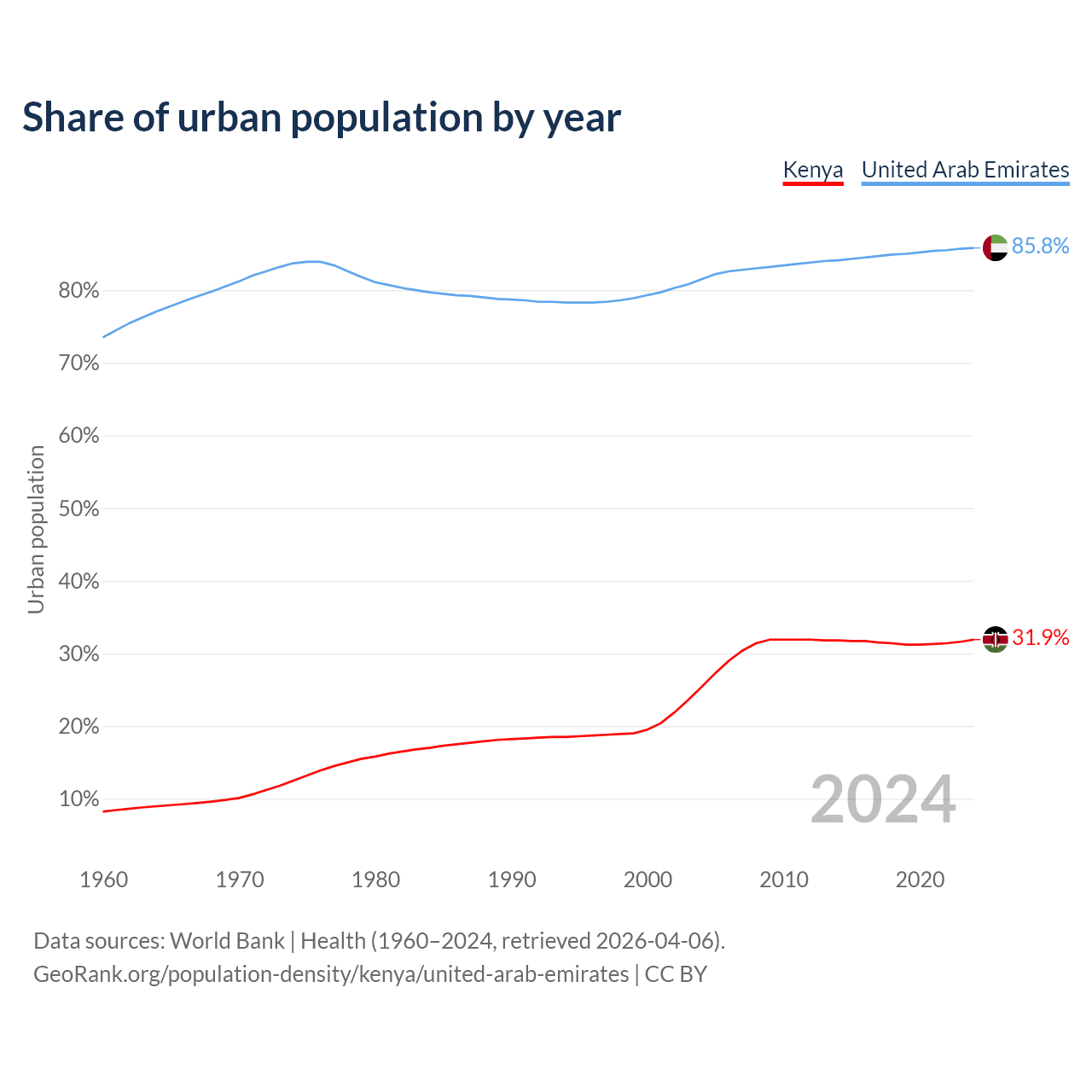 From 2004 to 2024, the share of urban population changed from 25.4% to 31.9% in Kenya and from 81.5% to 85.8% in the United Arab Emirates.