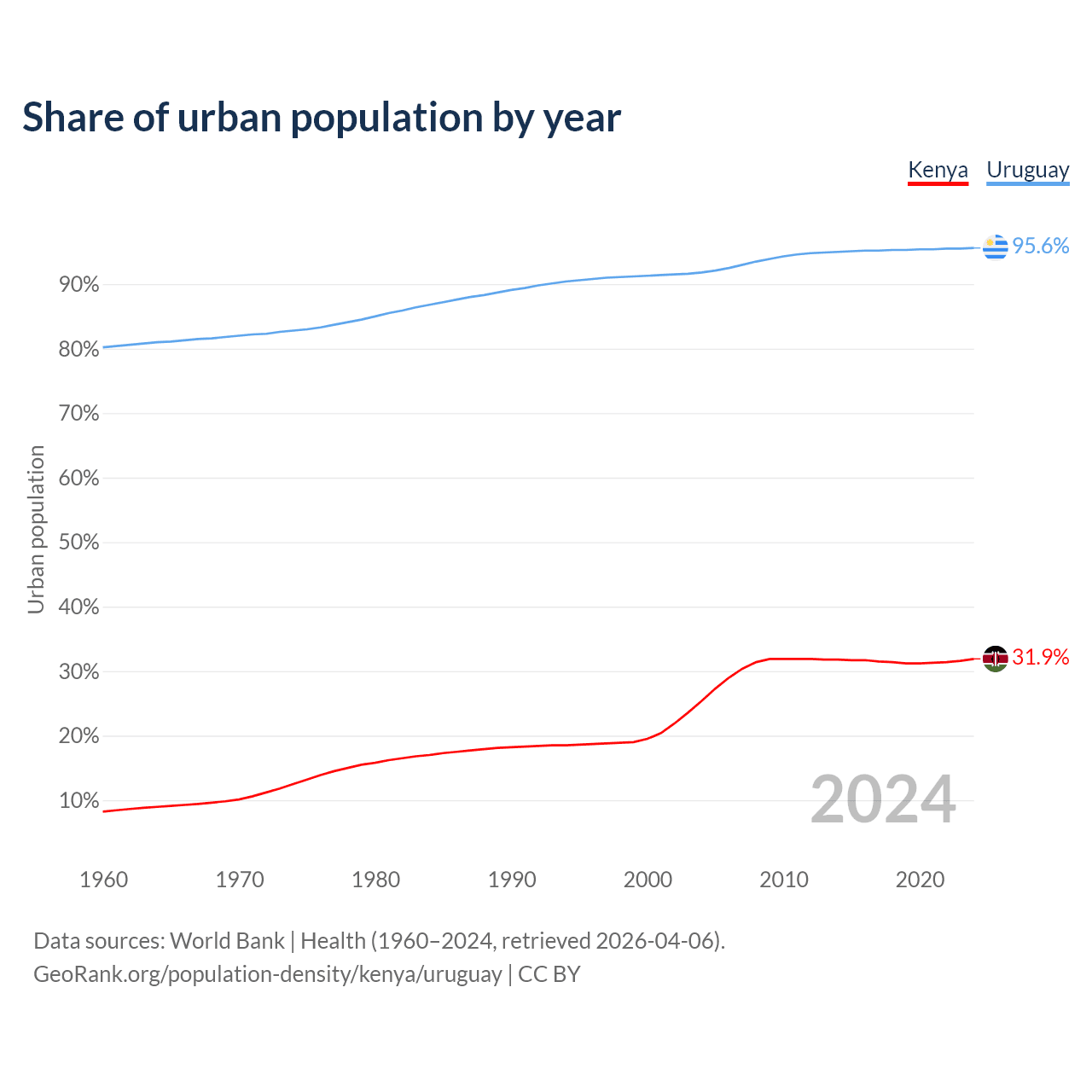 From 2004 to 2024, the share of urban population changed from 25.4% to 31.9% in Kenya and from 91.8% to 95.6% in Uruguay.