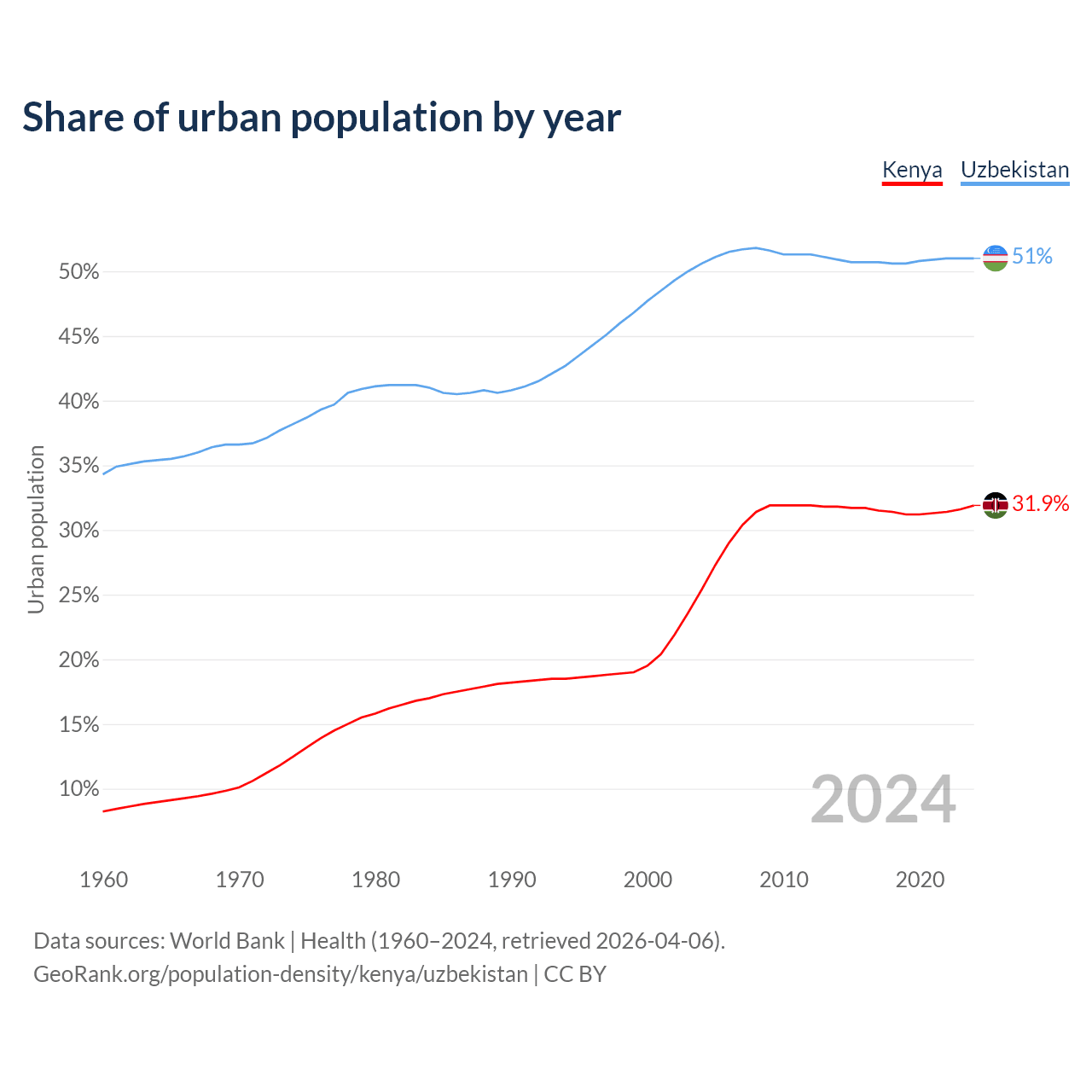 From 2004 to 2024, the share of urban population changed from 25.4% to 31.9% in Kenya and from 50.6% to 51% in Uzbekistan.