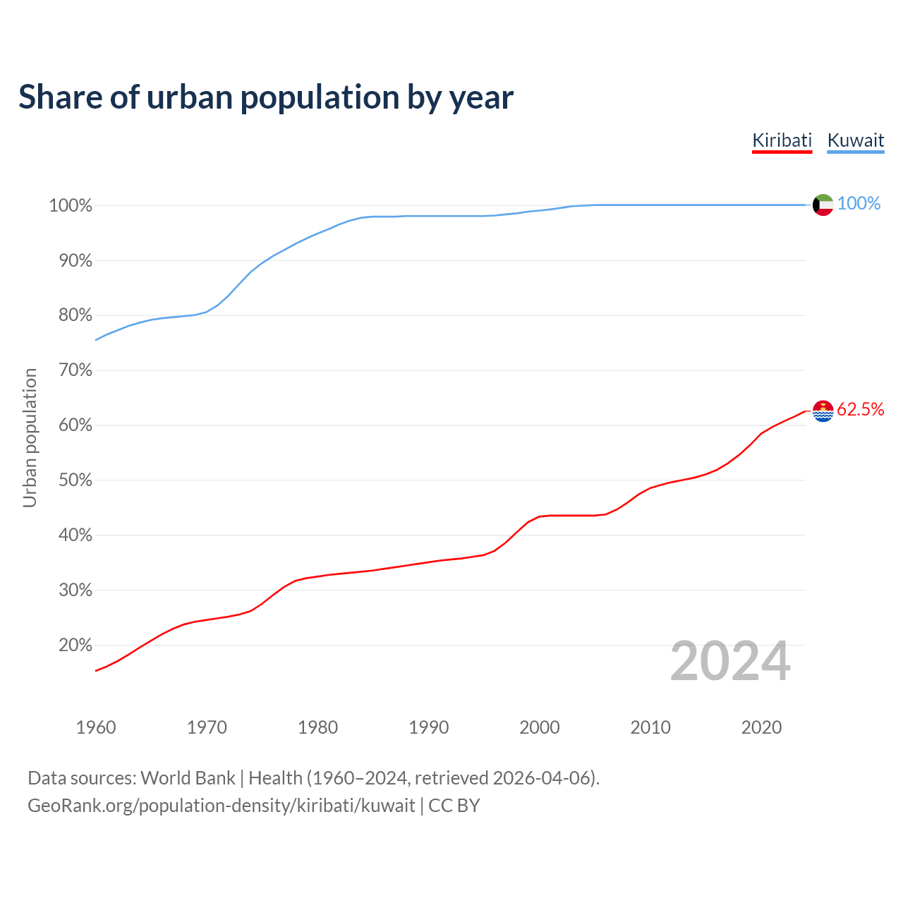 From 2004 to 2024, the share of urban population changed from 43.5% to 62.5% in Kiribati and from 99.9% to 100% in Kuwait.