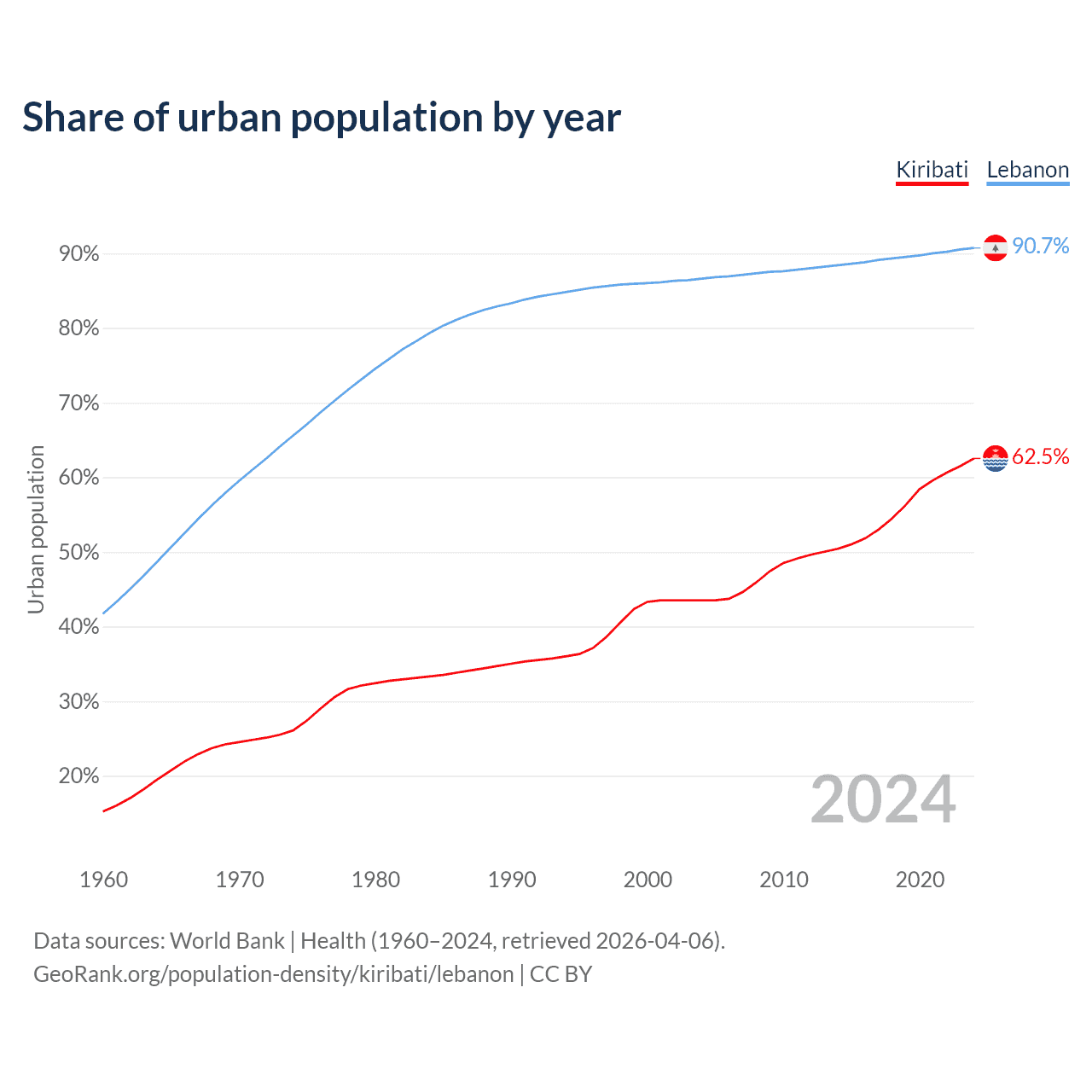 From 2004 to 2024, the share of urban population changed from 43.5% to 62.5% in Kiribati and from 86.6% to 90.7% in Lebanon.