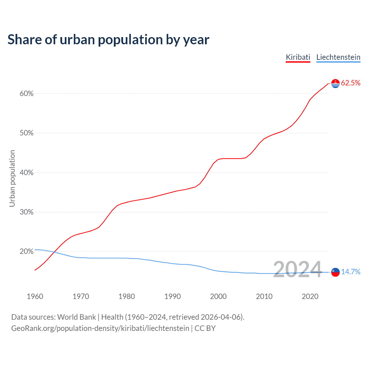 From 2004 to 2024, the share of urban population changed from 43.5% to 62.5% in Kiribati and from 14.7% to 14.7% in Liechtenstein.