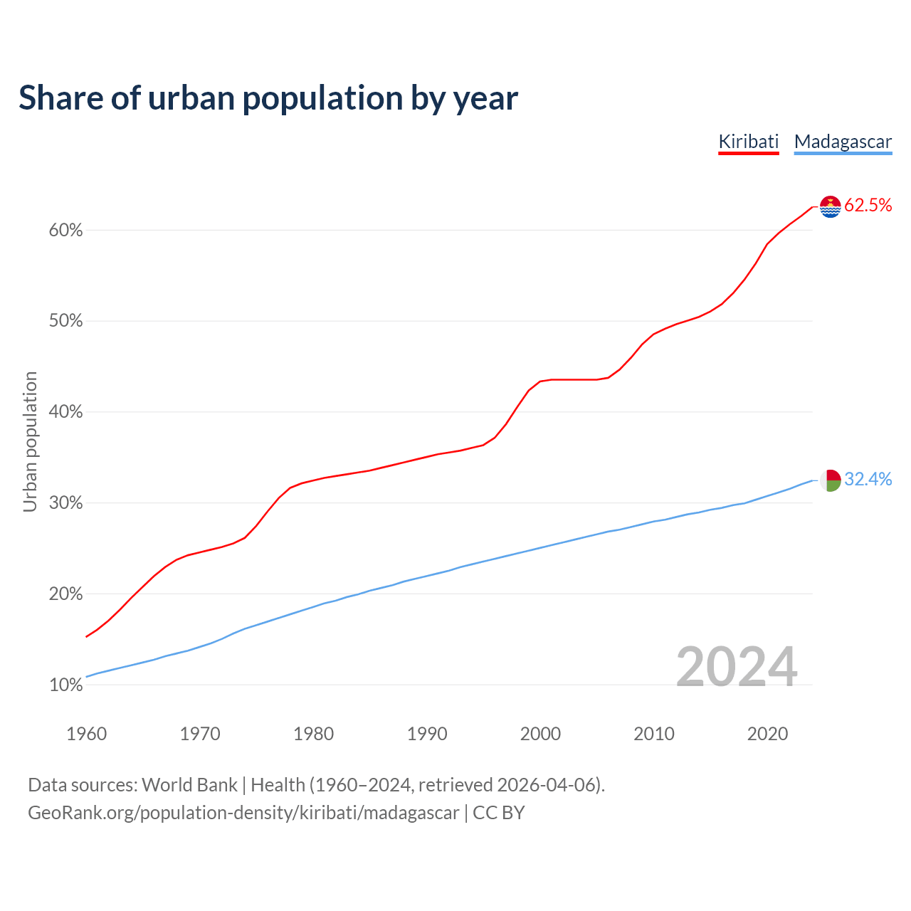 From 2004 to 2024, the share of urban population changed from 43.5% to 62.5% in Kiribati and from 26.2% to 32.4% in Madagascar.