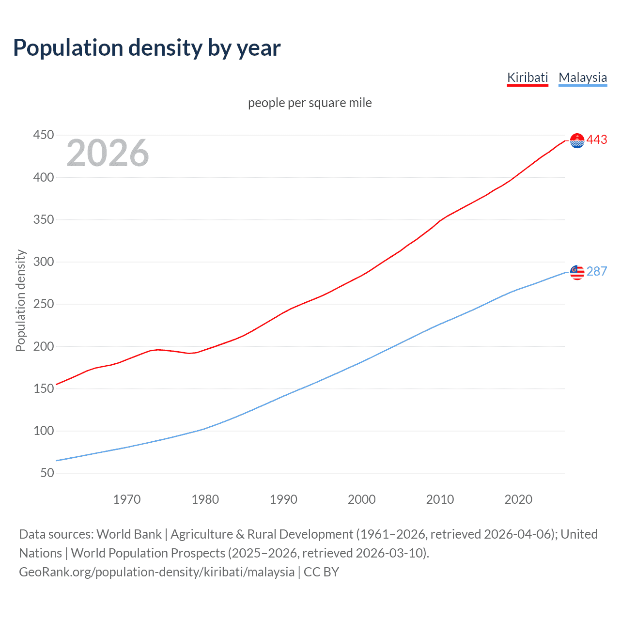 From 2006 to 2026, population density in Kiribati increased by 38.5%, compared to a 37.8% growth in Malaysia.