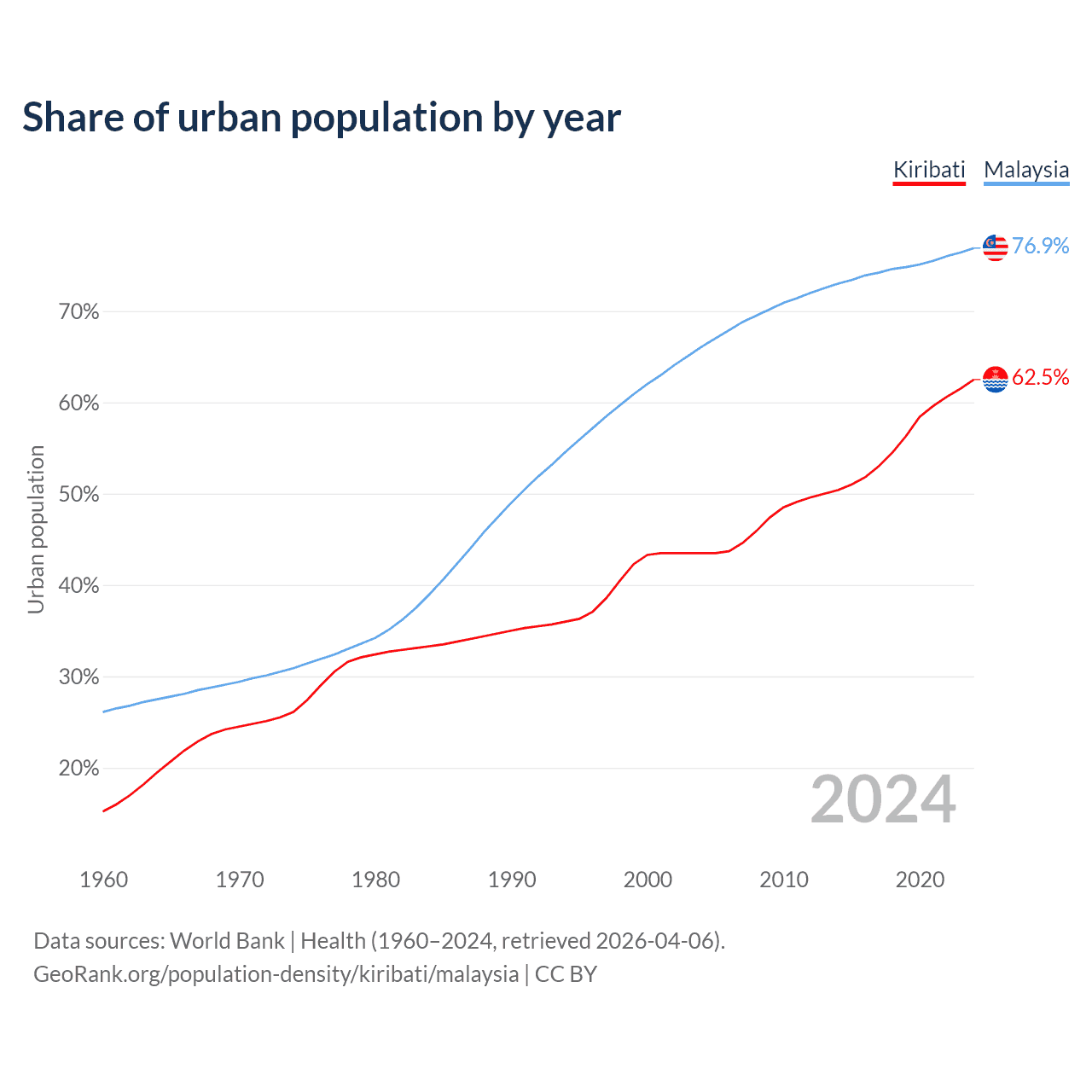 From 2004 to 2024, the share of urban population changed from 43.5% to 62.5% in Kiribati and from 66.1% to 76.9% in Malaysia.