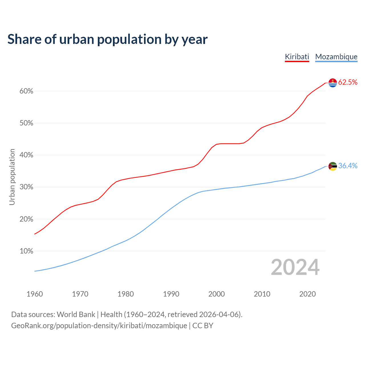 From 2004 to 2024, the share of urban population changed from 43.5% to 62.5% in Kiribati and from 29.9% to 36.4% in Mozambique.