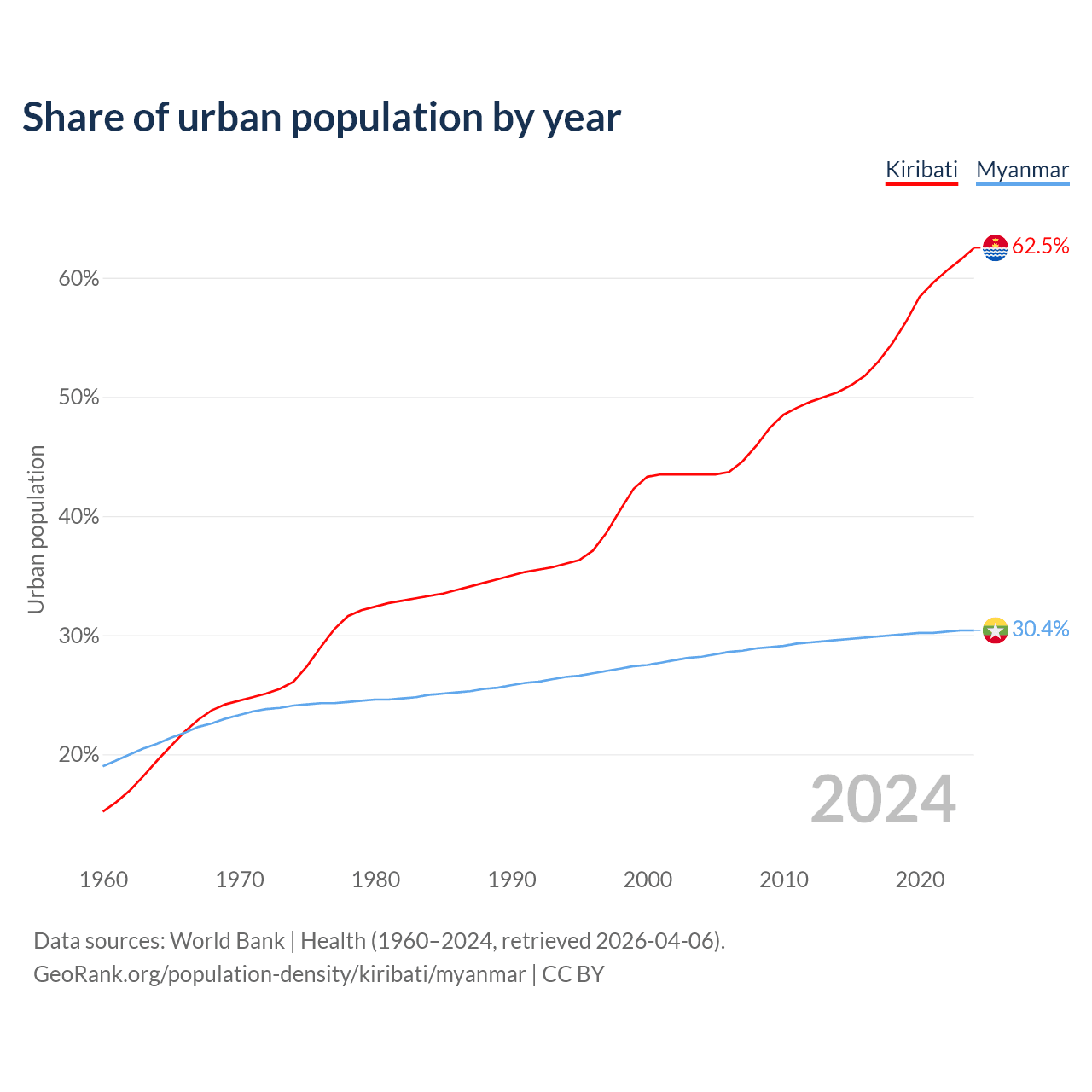 From 2004 to 2024, the share of urban population changed from 43.5% to 62.5% in Kiribati and from 28.2% to 30.4% in Myanmar.