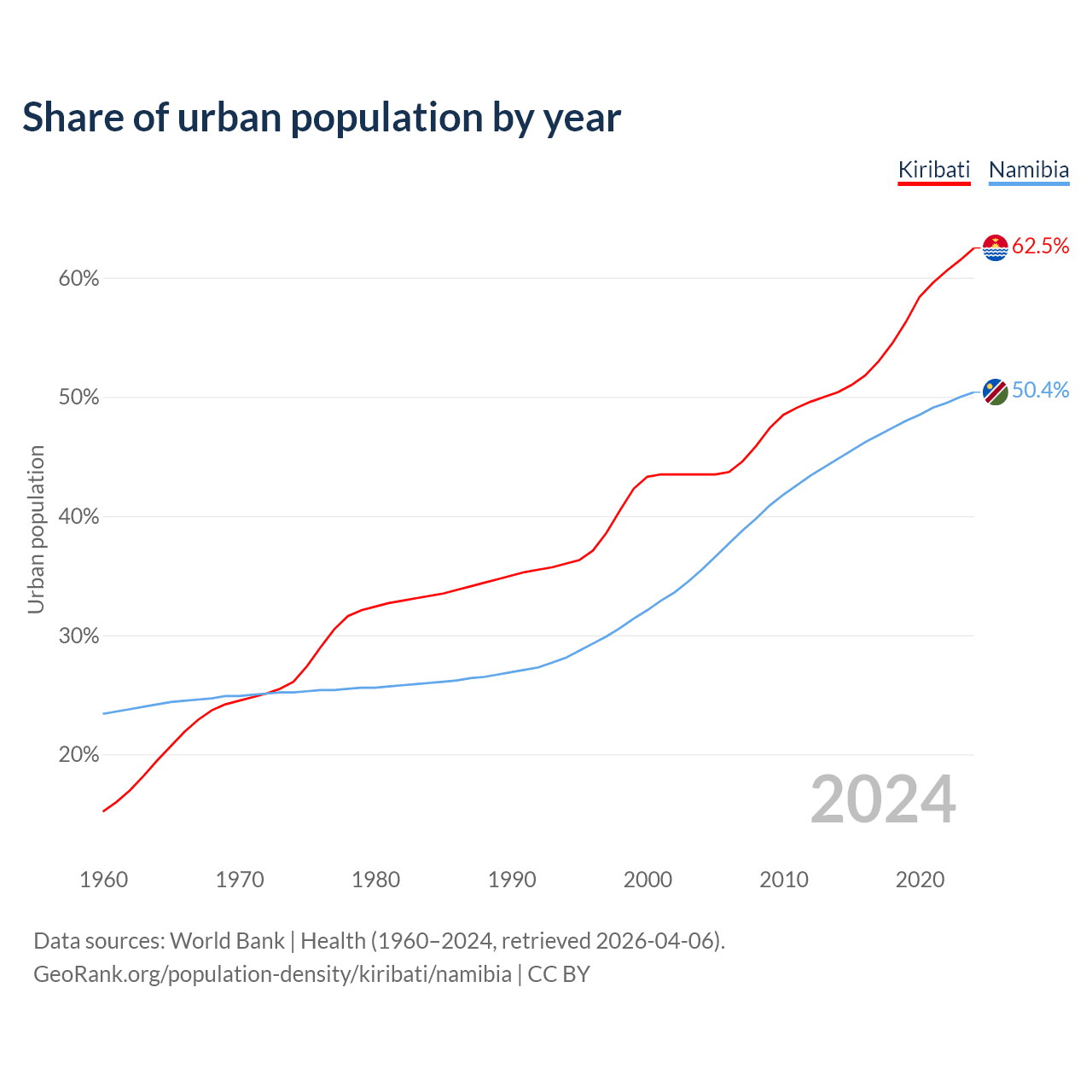 From 2004 to 2024, the share of urban population changed from 43.5% to 62.5% in Kiribati and from 35.5% to 50.4% in Namibia.