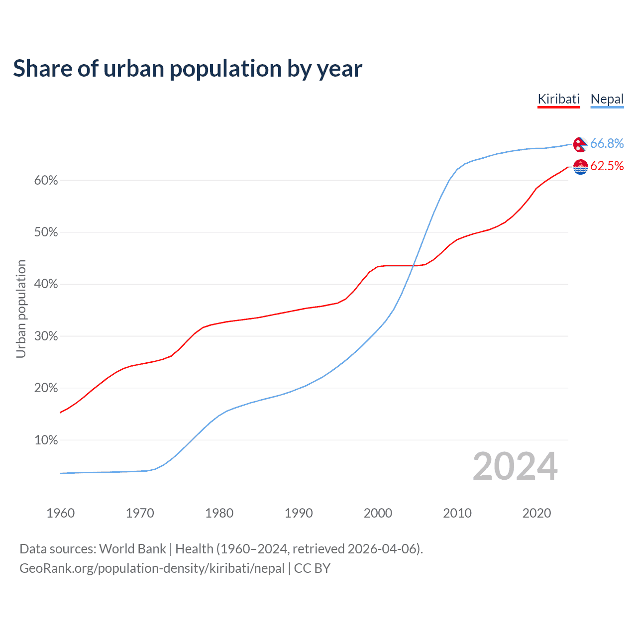From 2004 to 2024, the share of urban population changed from 43.5% to 62.5% in Kiribati and from 41.6% to 66.8% in Nepal.