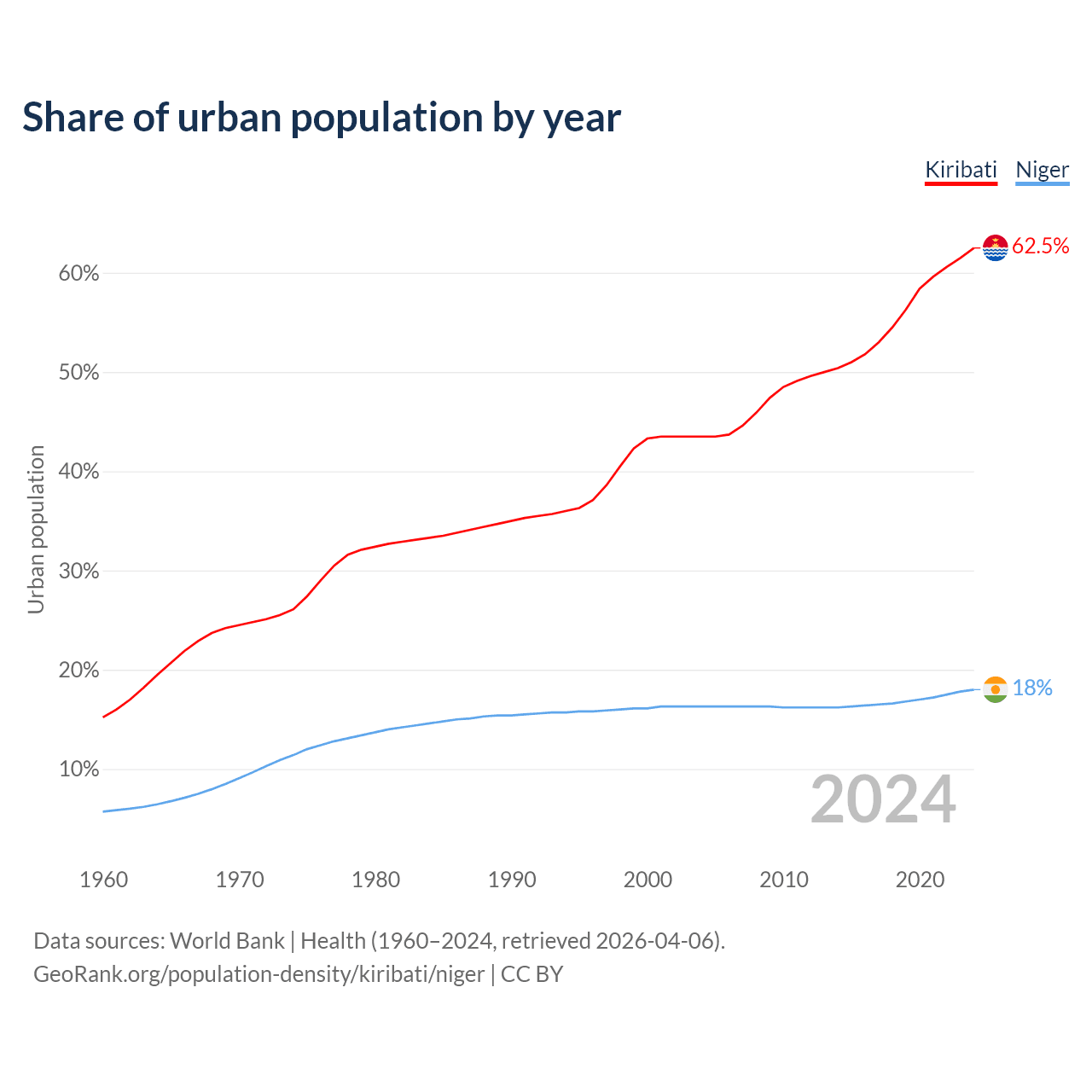From 2004 to 2024, the share of urban population changed from 43.5% to 62.5% in Kiribati and from 16.3% to 18% in Niger.