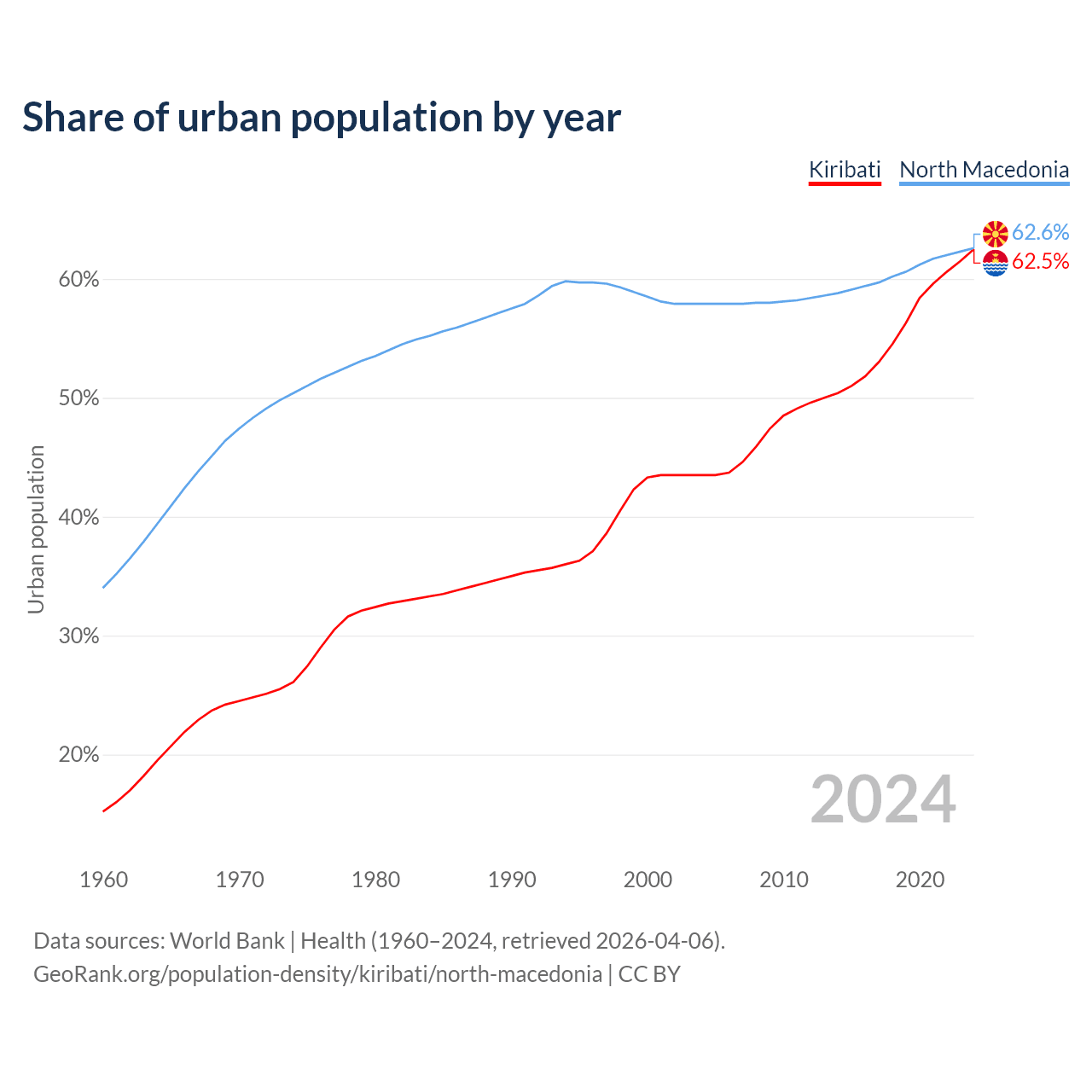 From 2004 to 2024, the share of urban population changed from 43.5% to 62.5% in Kiribati and from 57.9% to 62.6% in North Macedonia.