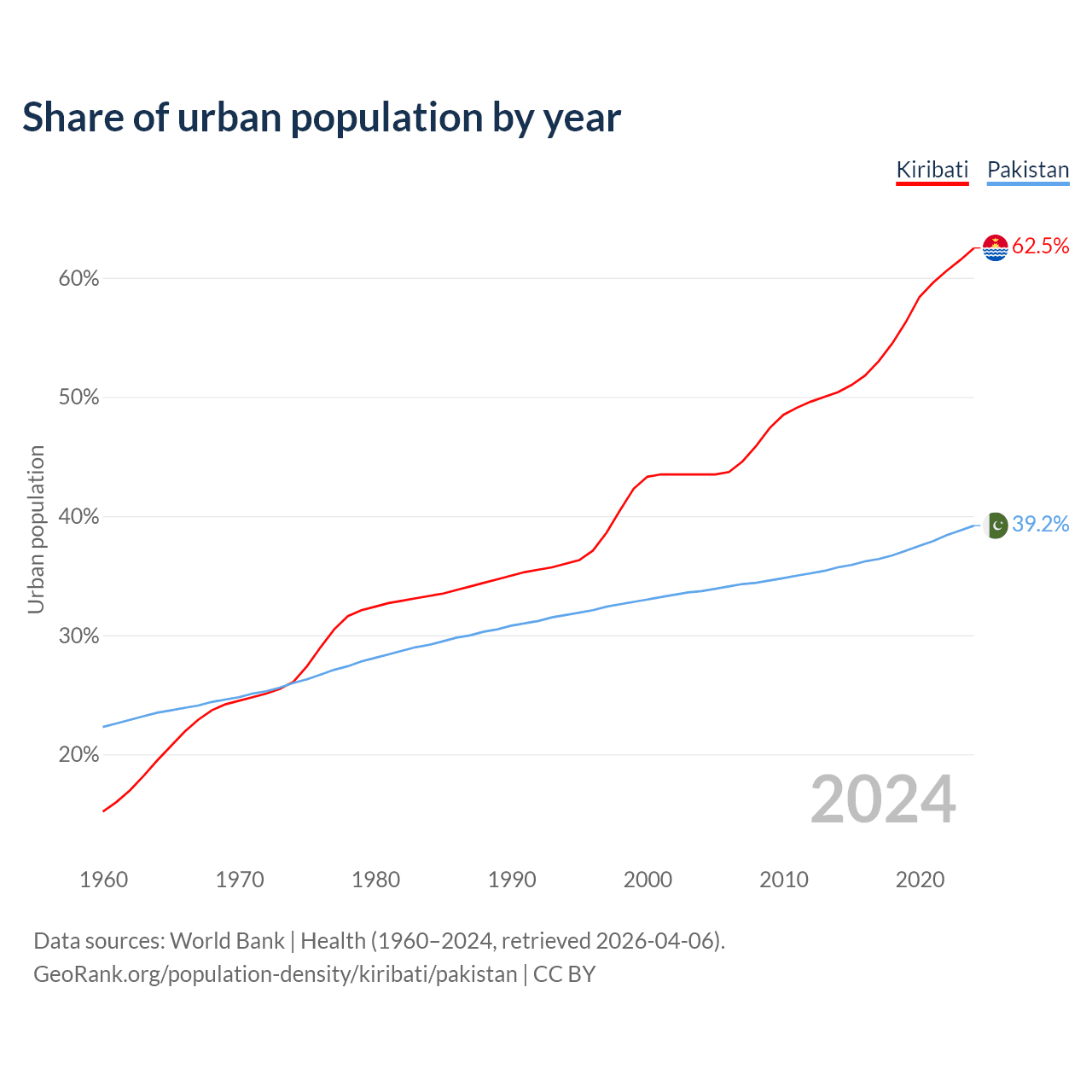 From 2004 to 2024, the share of urban population changed from 43.5% to 62.5% in Kiribati and from 33.7% to 39.2% in Pakistan.