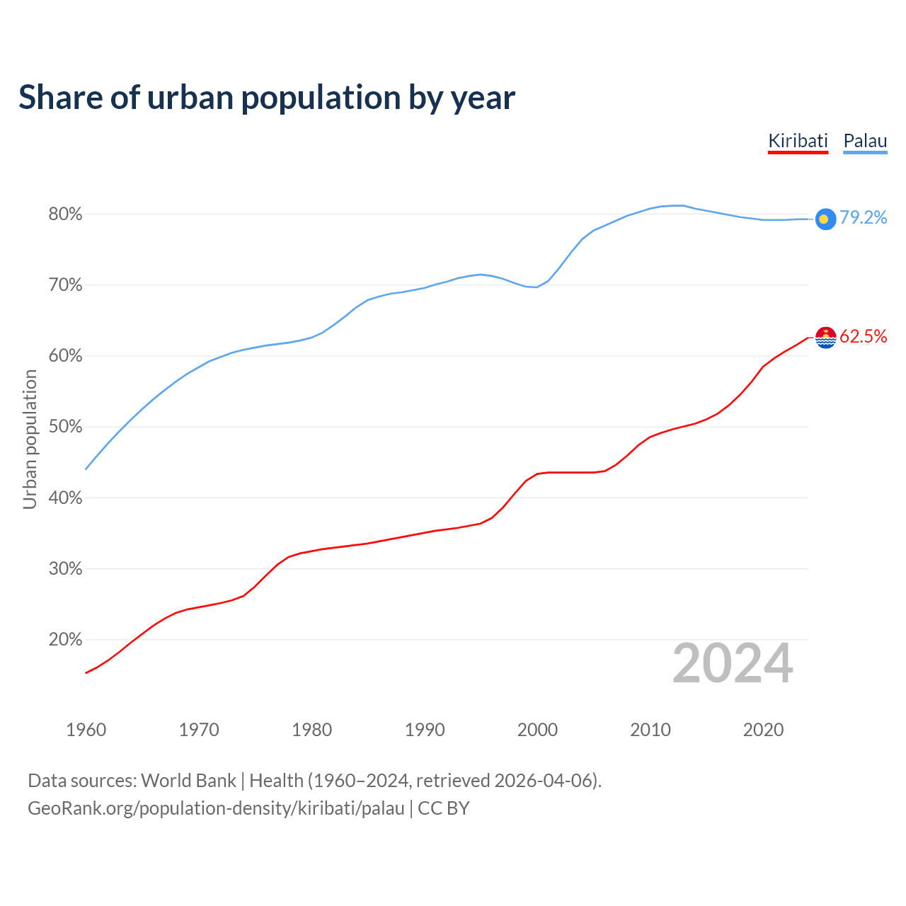 From 2004 to 2024, the share of urban population changed from 43.5% to 62.5% in Kiribati and from 76.4% to 79.2% in Palau.