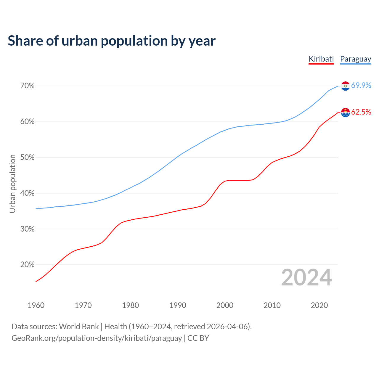 From 2004 to 2024, the share of urban population changed from 43.5% to 62.5% in Kiribati and from 58.7% to 69.9% in Paraguay.
