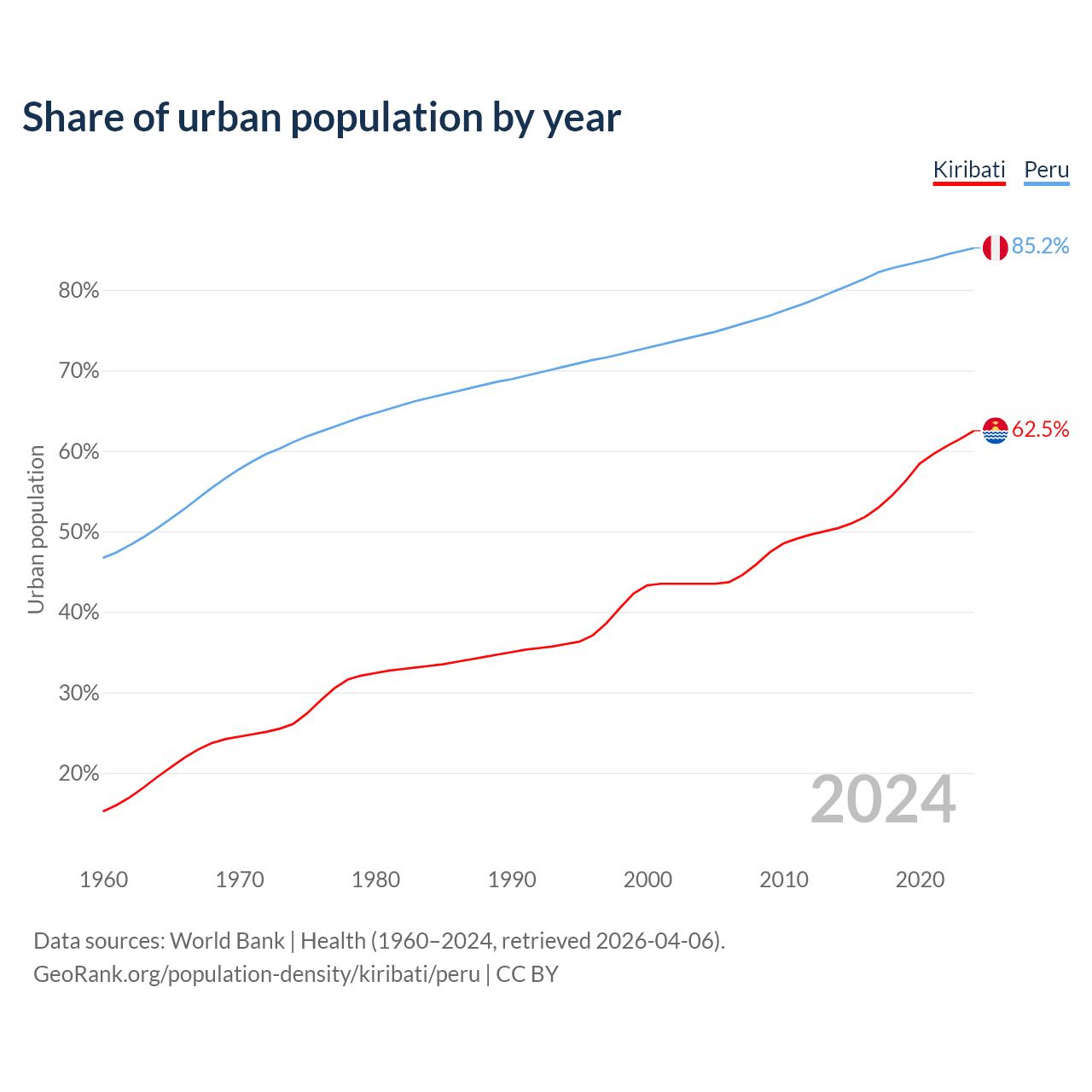 From 2004 to 2024, the share of urban population changed from 43.5% to 62.5% in Kiribati and from 74.4% to 85.2% in Peru.