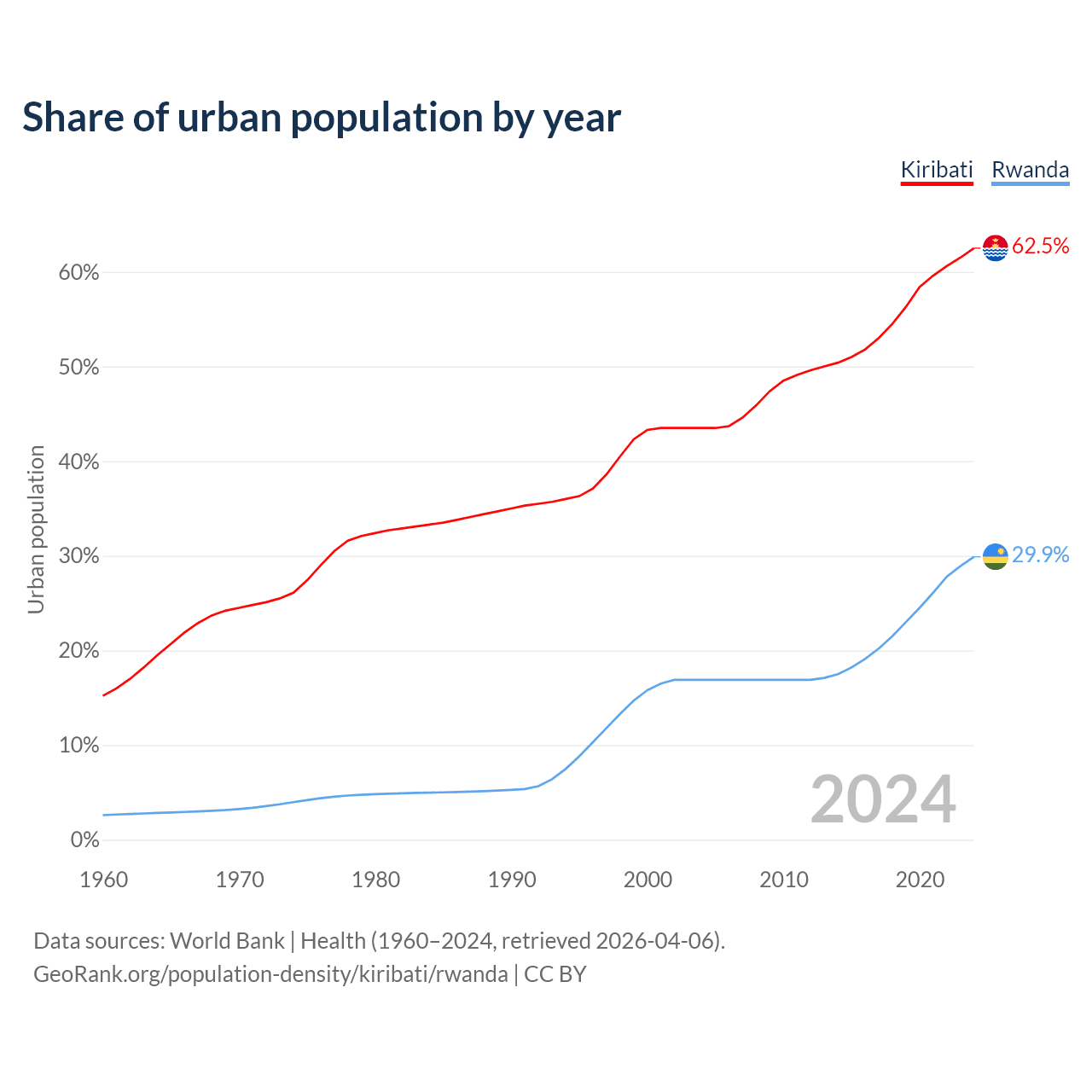 From 2006 to 2026, population density in Kiribati increased by 38.5%, compared to a 60.1% growth in Rwanda.