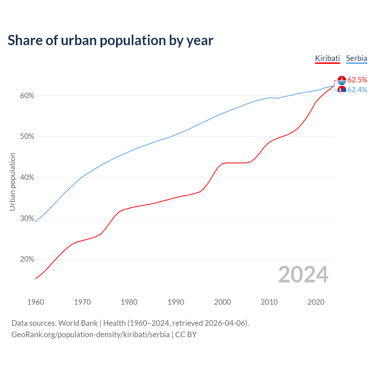 From 2004 to 2024, the share of urban population changed from 43.5% to 62.5% in Kiribati and from 57.3% to 62.4% in Serbia.