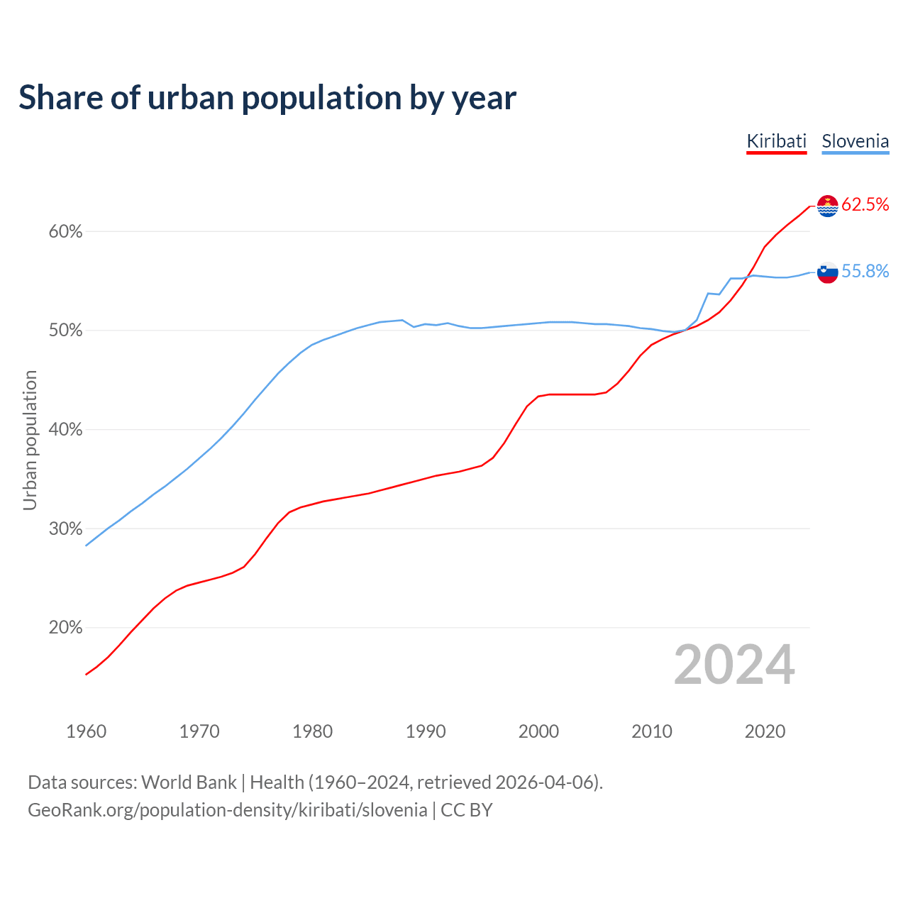 From 2004 to 2024, the share of urban population changed from 43.5% to 62.5% in Kiribati and from 50.7% to 55.8% in Slovenia.