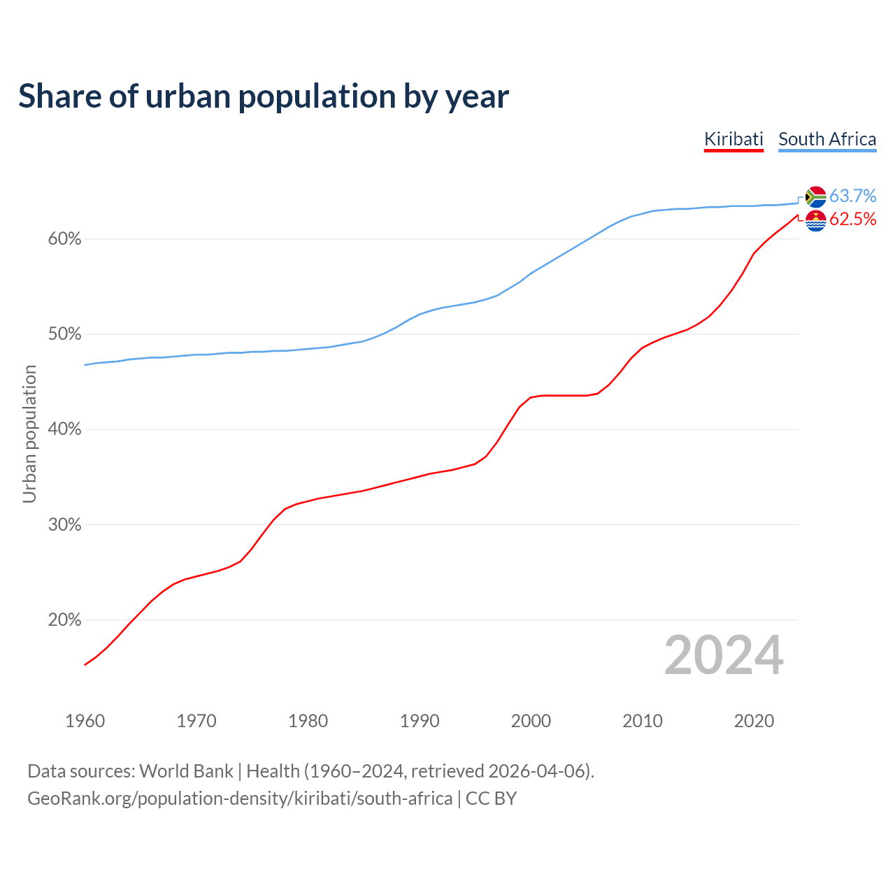 From 2004 to 2024, the share of urban population changed from 43.5% to 62.5% in Kiribati and from 59.1% to 63.7% in South Africa.