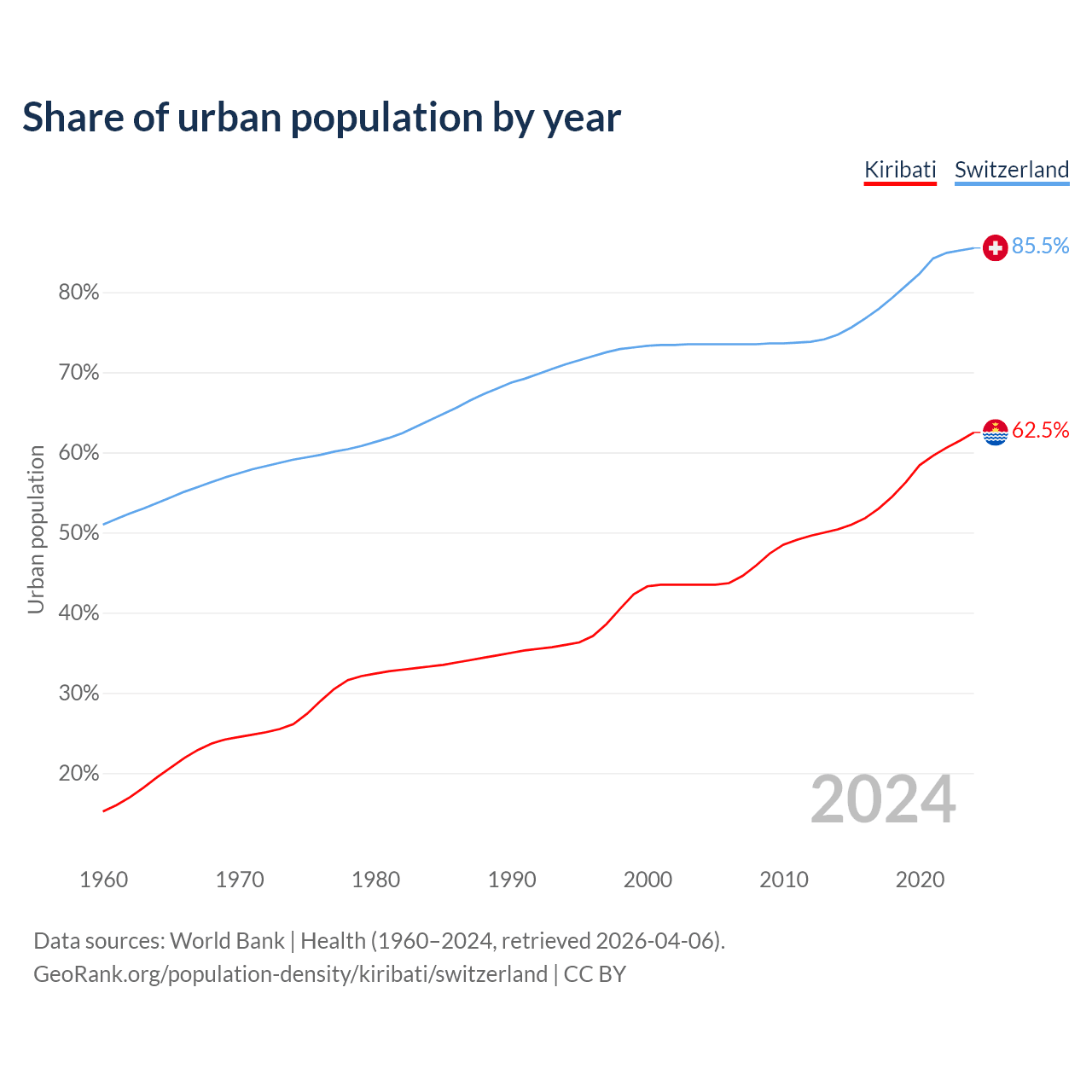 From 2004 to 2024, the share of urban population changed from 43.5% to 62.5% in Kiribati and from 73.5% to 85.5% in Switzerland.