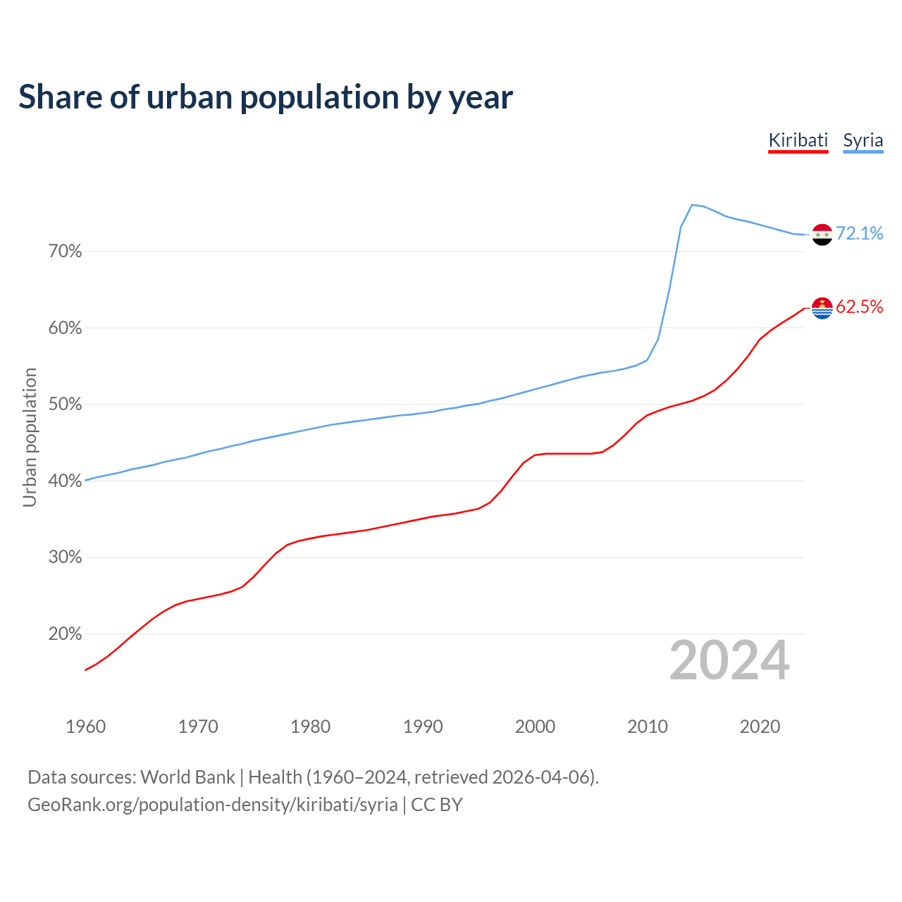 From 2004 to 2024, the share of urban population changed from 43.5% to 62.5% in Kiribati and from 53.5% to 72.1% in Syria.