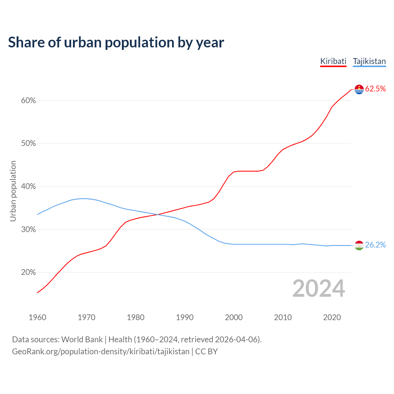 From 2004 to 2024, the share of urban population changed from 43.5% to 62.5% in Kiribati and from 26.5% to 26.2% in Tajikistan.