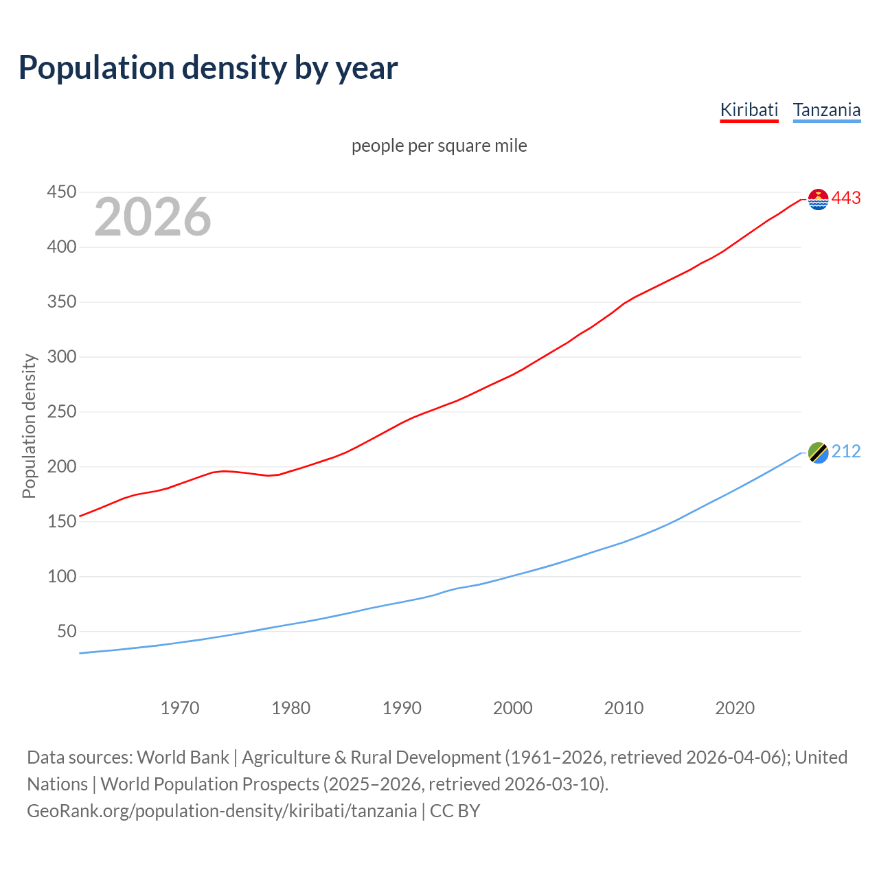From 2006 to 2026, population density in Kiribati increased by 38.5%, compared to a 80.1% growth in Tanzania.