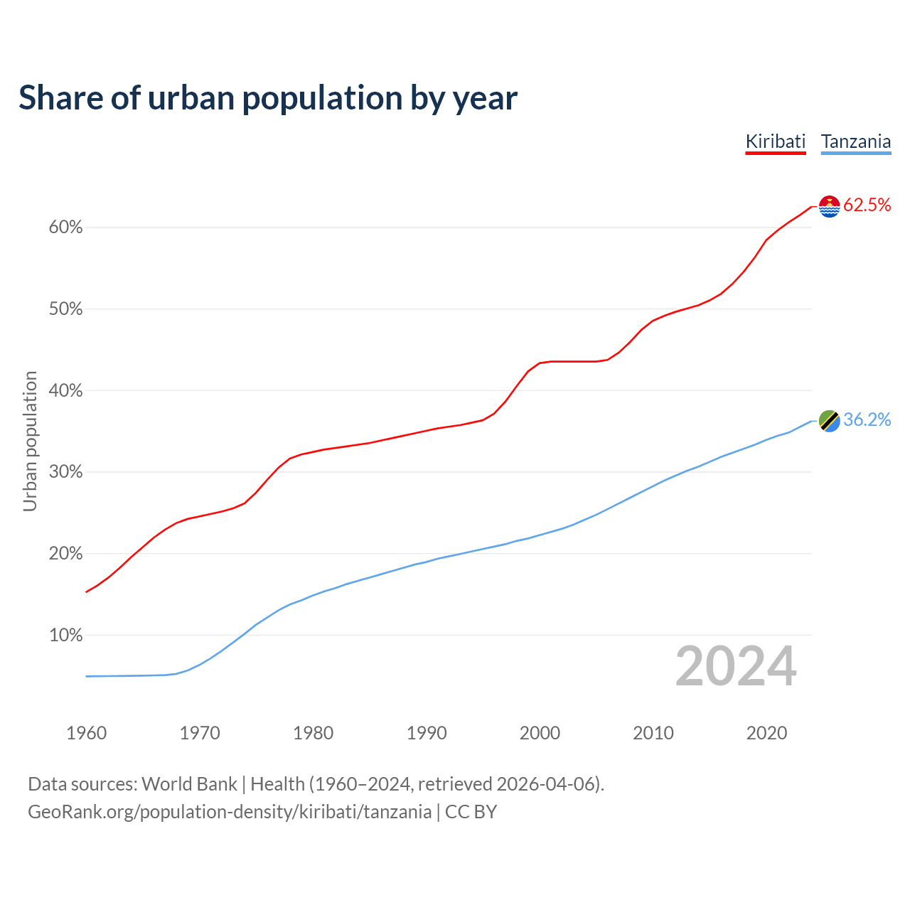 From 2004 to 2024, the share of urban population changed from 43.5% to 62.5% in Kiribati and from 24.1% to 36.2% in Tanzania.