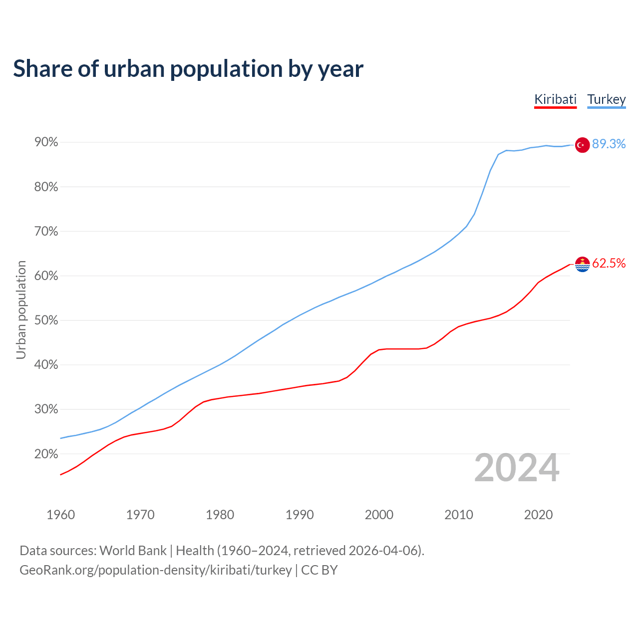 From 2004 to 2024, the share of urban population changed from 43.5% to 62.5% in Kiribati and from 62.4% to 89.3% in Turkey.