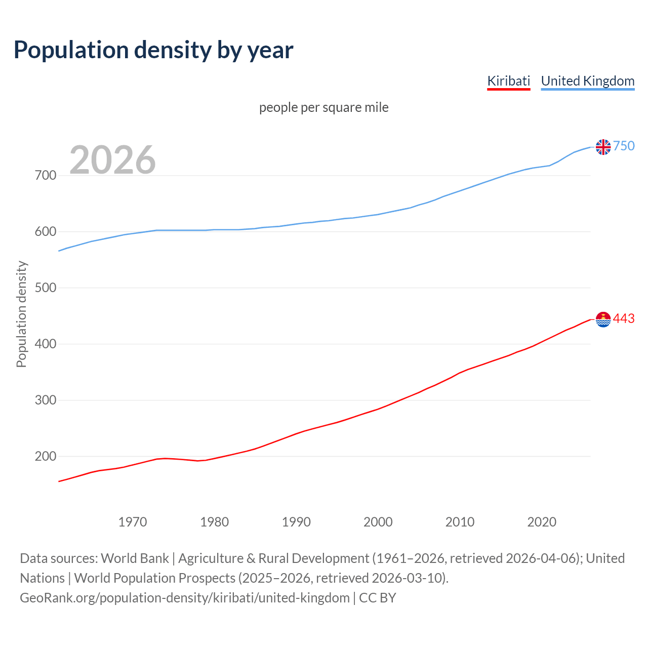 From 2006 to 2026, population density in Kiribati increased by 38.5%, compared to a 15.1% growth in the United Kingdom.