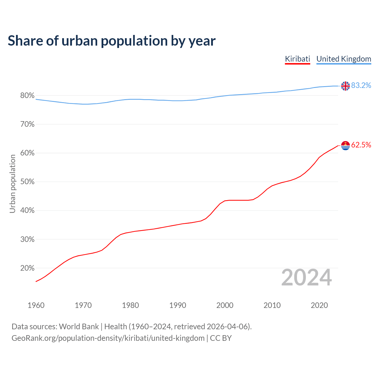 From 2004 to 2024, the share of urban population changed from 43.5% to 62.5% in Kiribati and from 80.3% to 83.2% in the United Kingdom.