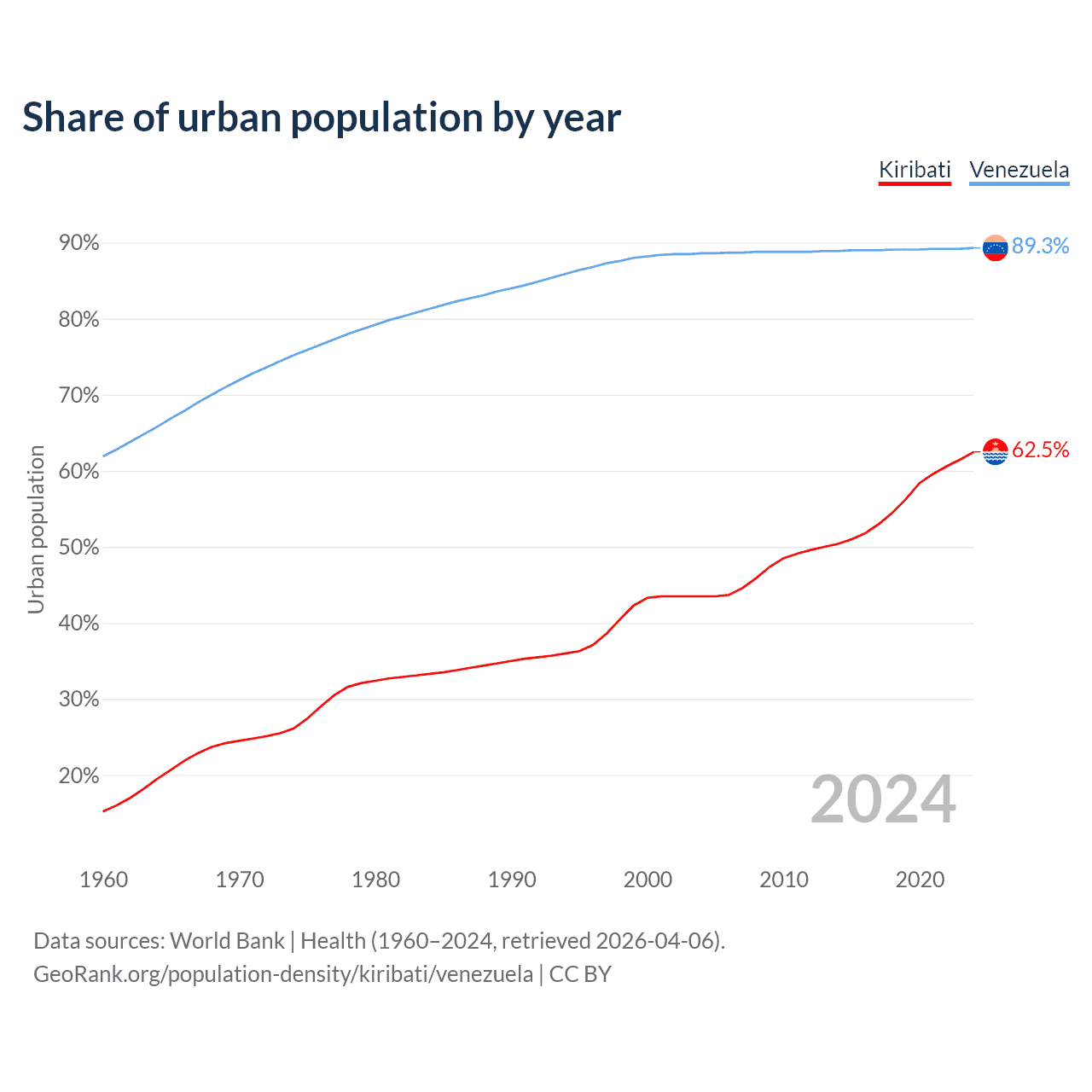 From 2004 to 2024, the share of urban population changed from 43.5% to 62.5% in Kiribati and from 88.6% to 89.3% in Venezuela.